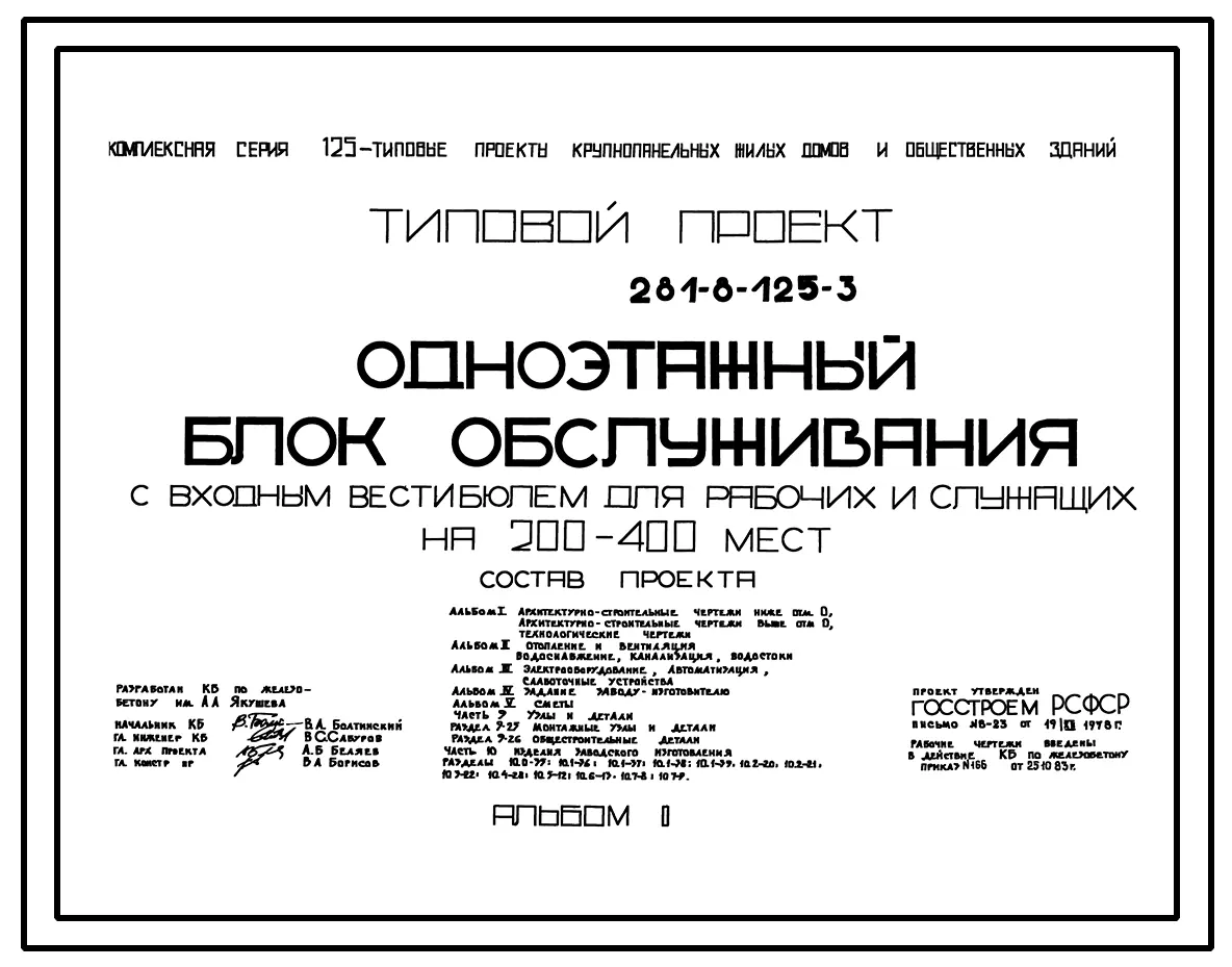 Типовой проект 281-8-125-3 Одноэтажный блок обслуживания с входным вестибюлем общежитий для рабочих и служащих на 200 – 400 мест. Здание в конструкциях серии 125. Стены из однослойных легкобетонных панелей.