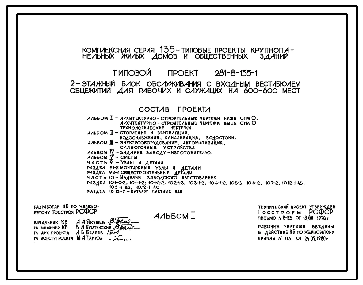 Типовой проект 281-8-135-1 Блок обслуживания с входным вестибюлем общежитий для рабочих и служащих на 600-800 мест