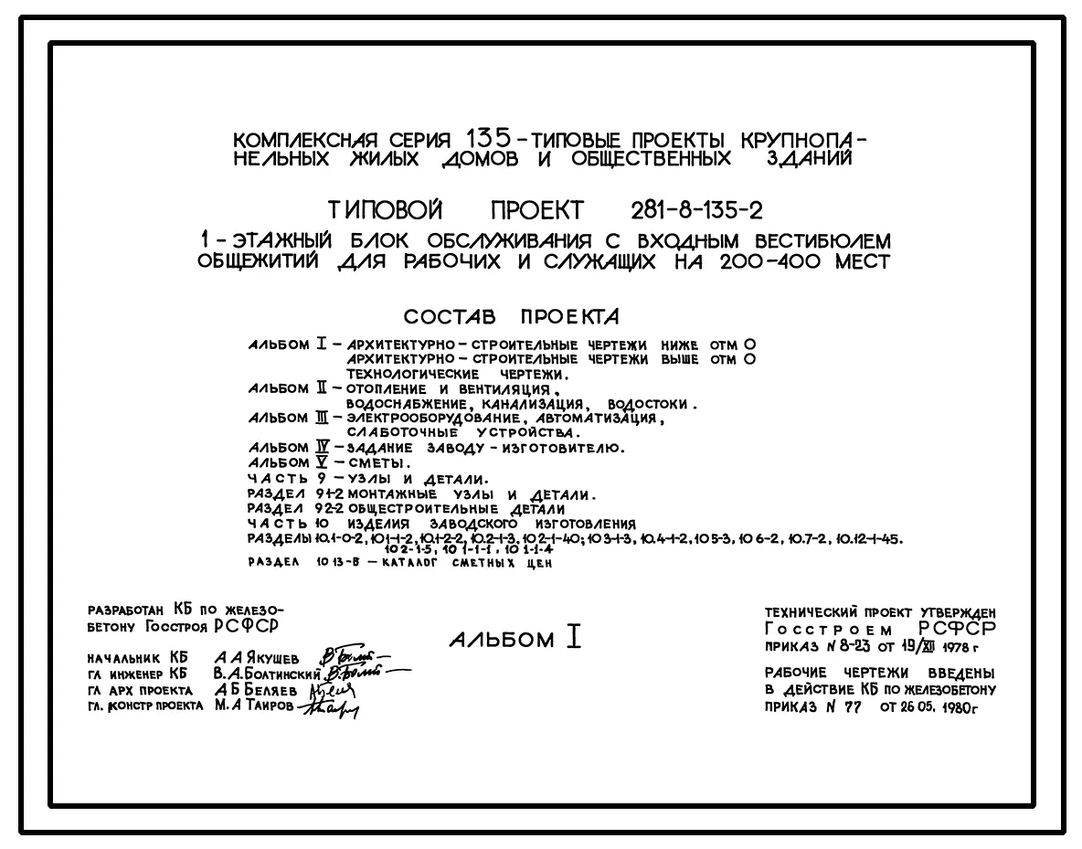 Типовой проект 281-8-135-2 Одноэтажный блок обслуживания с входным вестибюлем общежитий для рабочих и служащих на 200-400 мест.