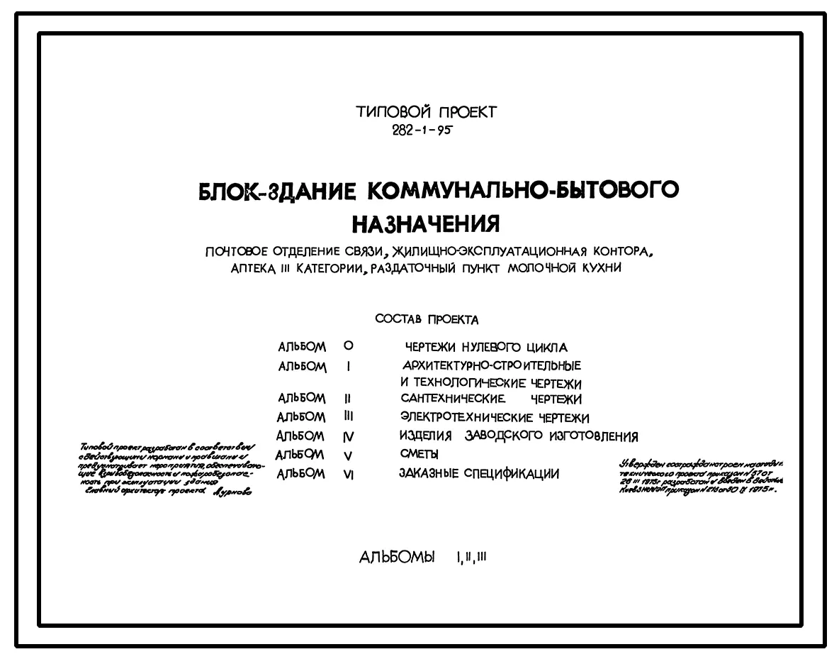 Типовой проект 282-1-95 БЛОК-ЗДАНИЕ КОММУНЕЛЬНО-БЫТОВОГО НАЗНАЧЕНИЯ /ПОЧТОВОЕ ОТДЕЛЕНИЕ СВЯЗИ, ЖИЛИЩНО-ЭКСПЛУАТАЦИОННАЯ КОНТОРА, АПТЕКА 3 КАТЕГОРИИ, РАЗДАТОЧНЫЙ ПУНКТ МОЛОЧНОЙ КУХНИ/.