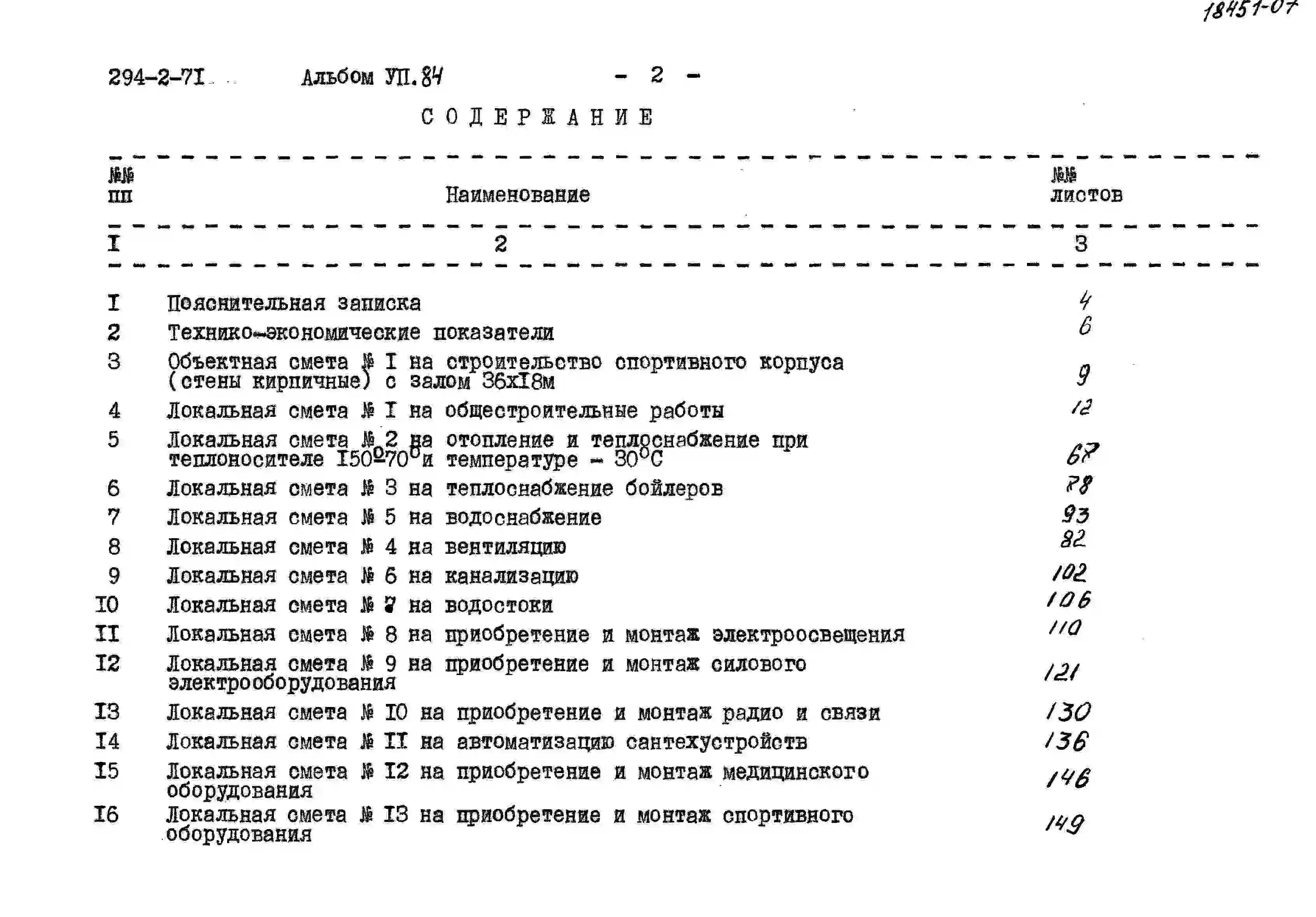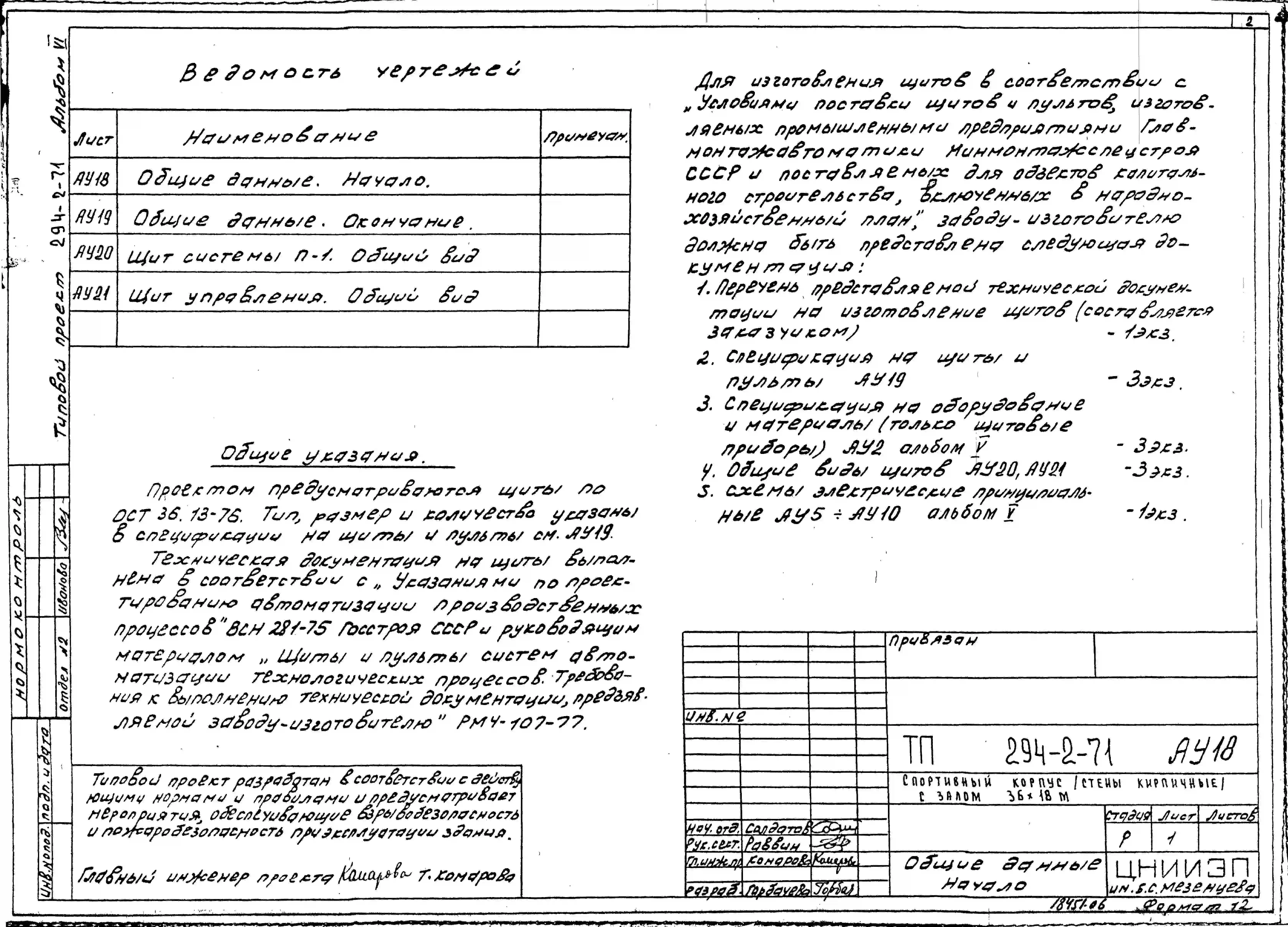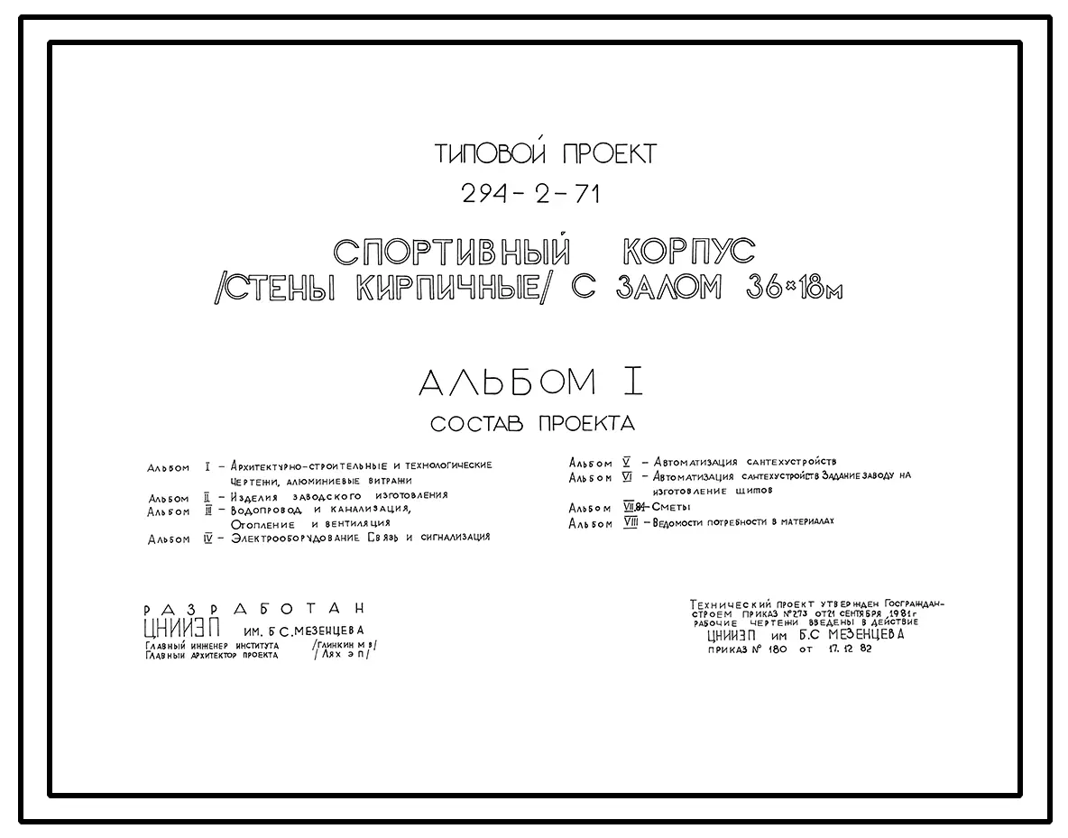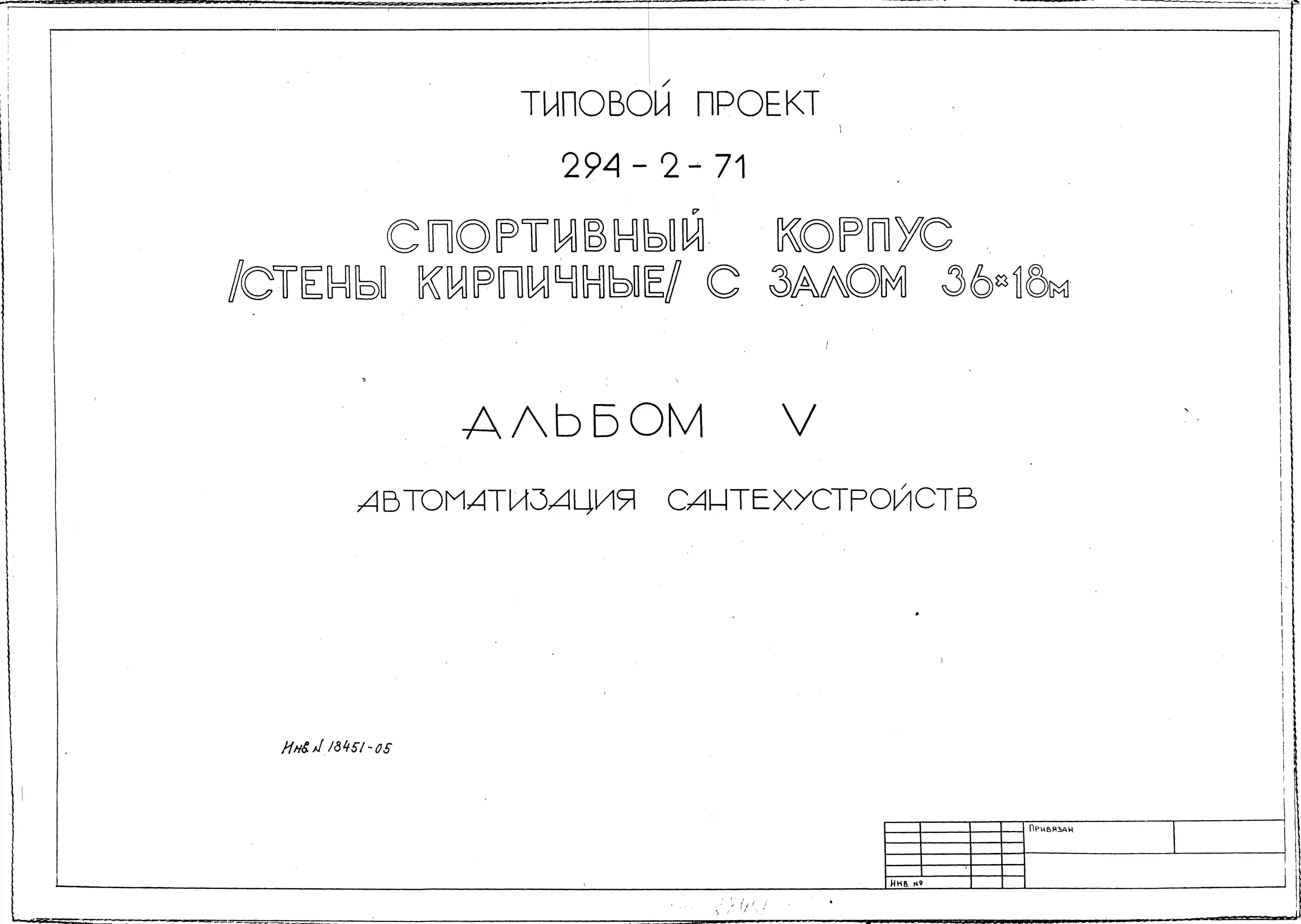 Типовой проект 294-2-71 Спортивный корпус с залом 36х18м. Здание одноэтажное. Стены из кирпича.