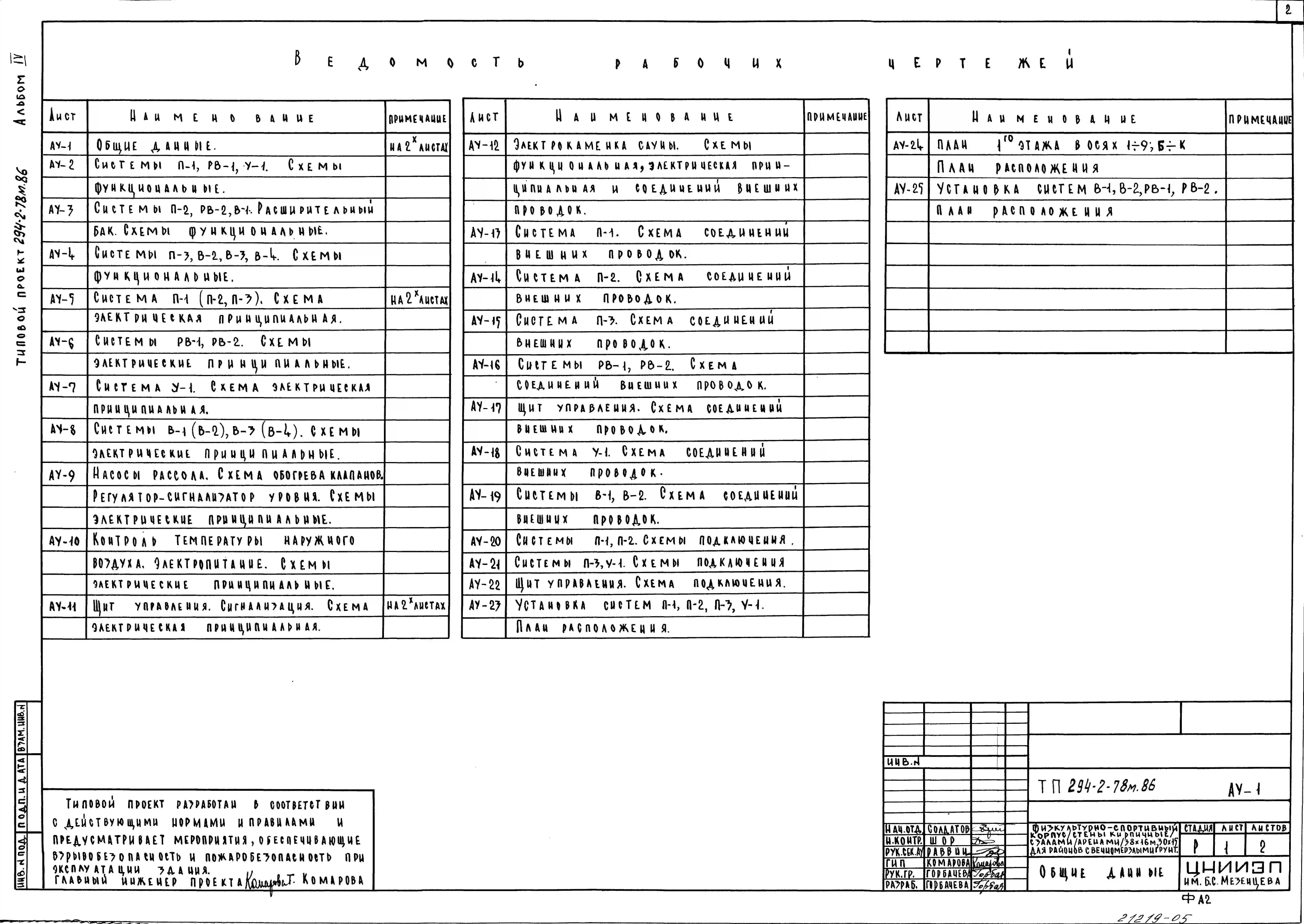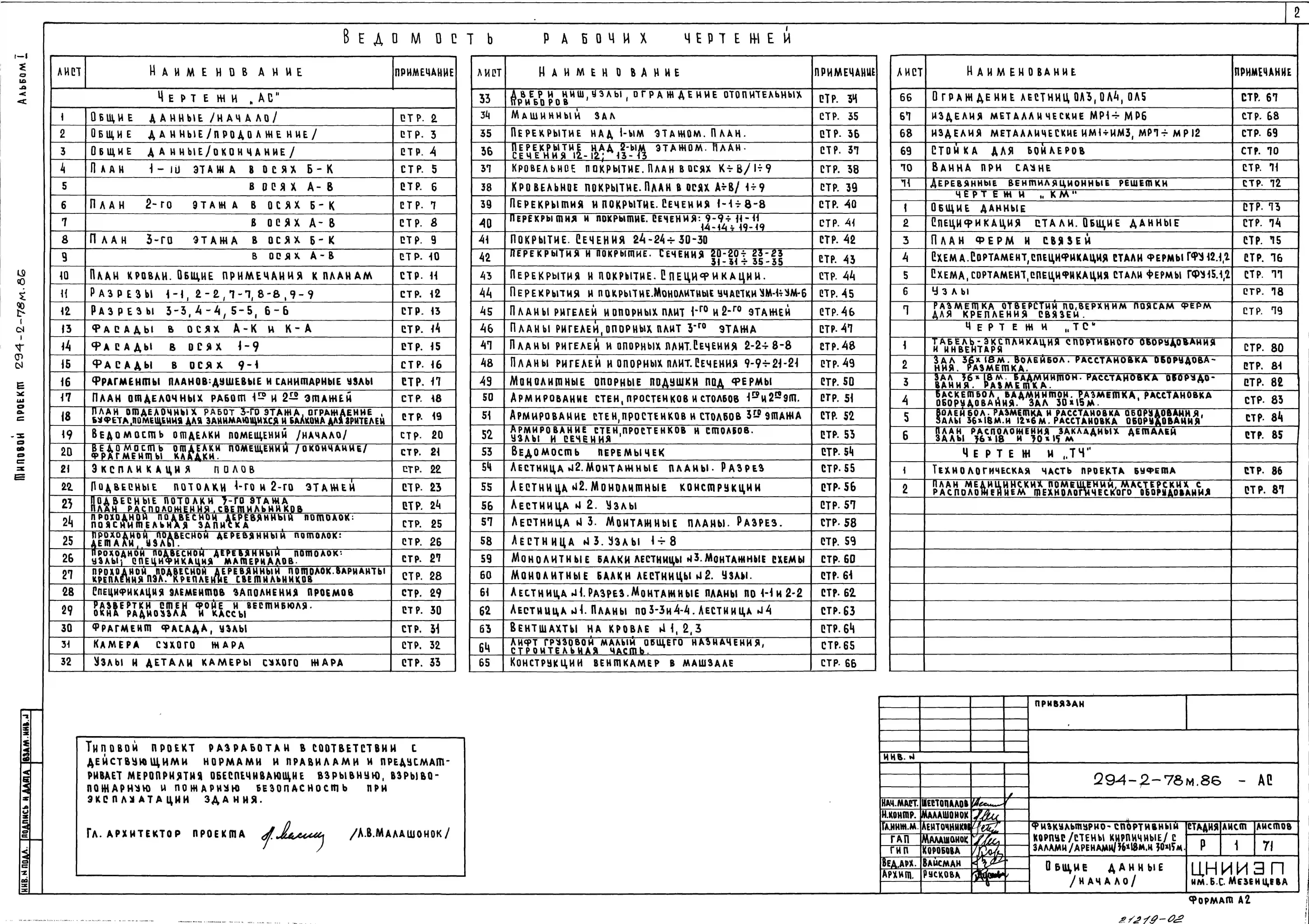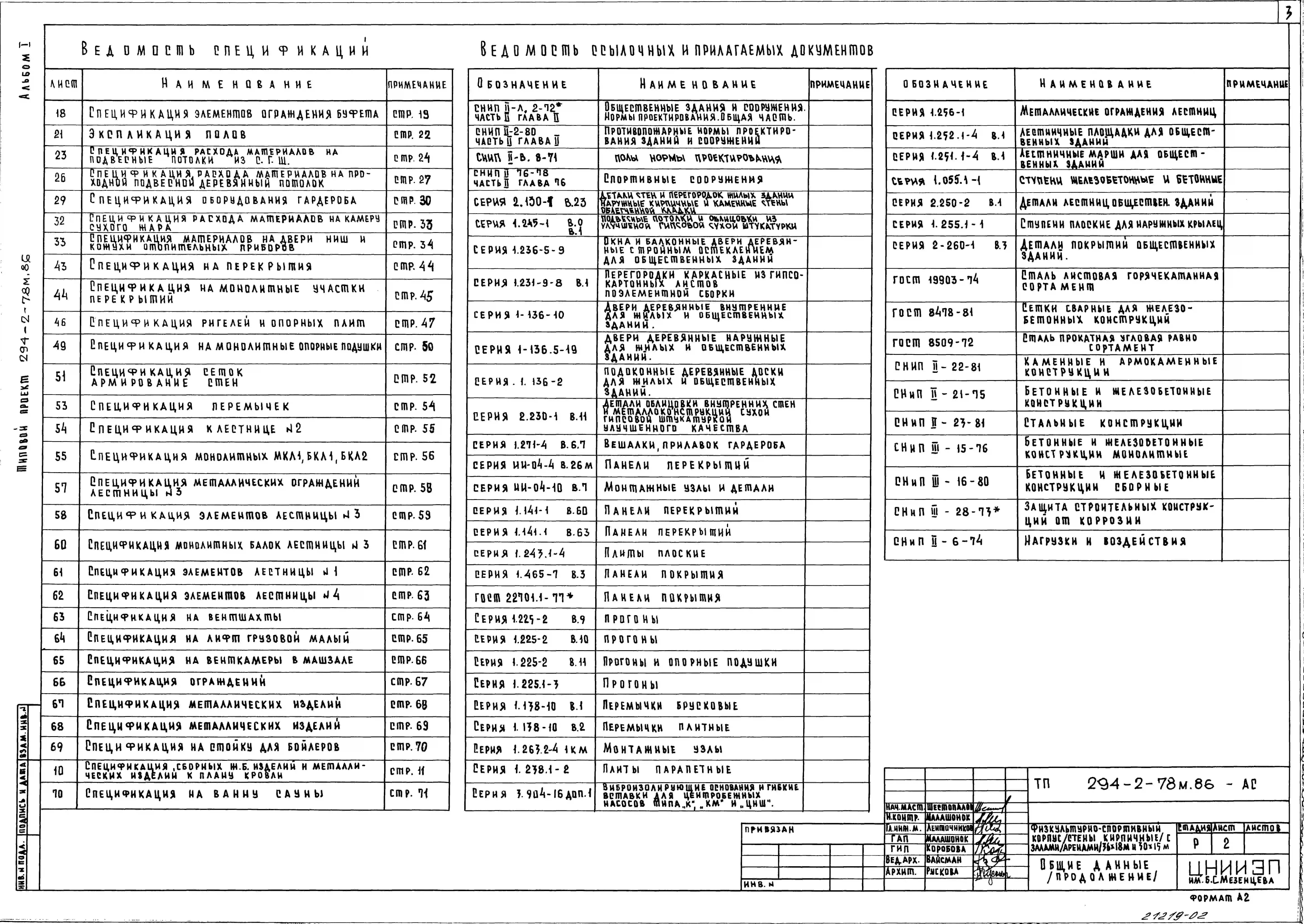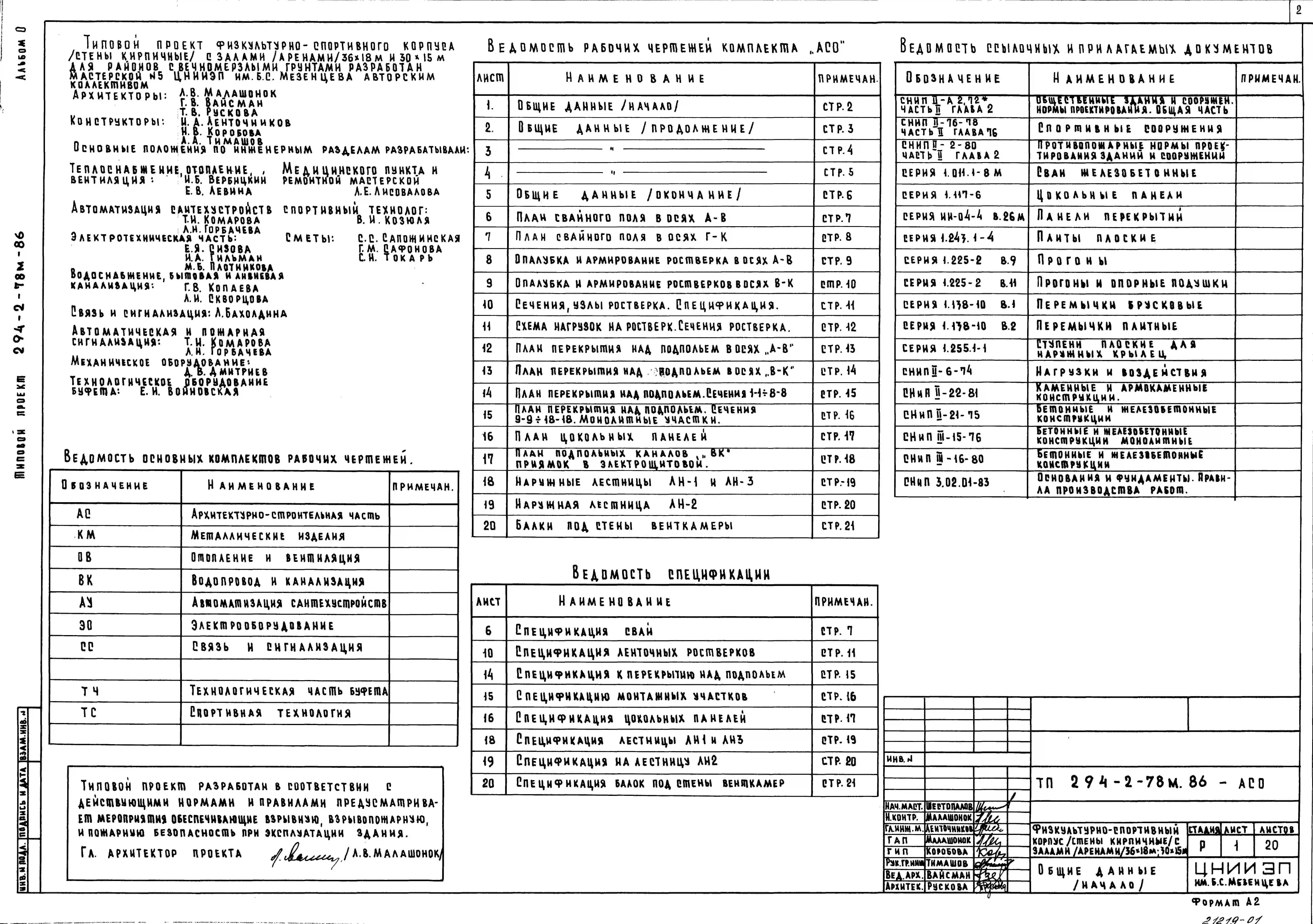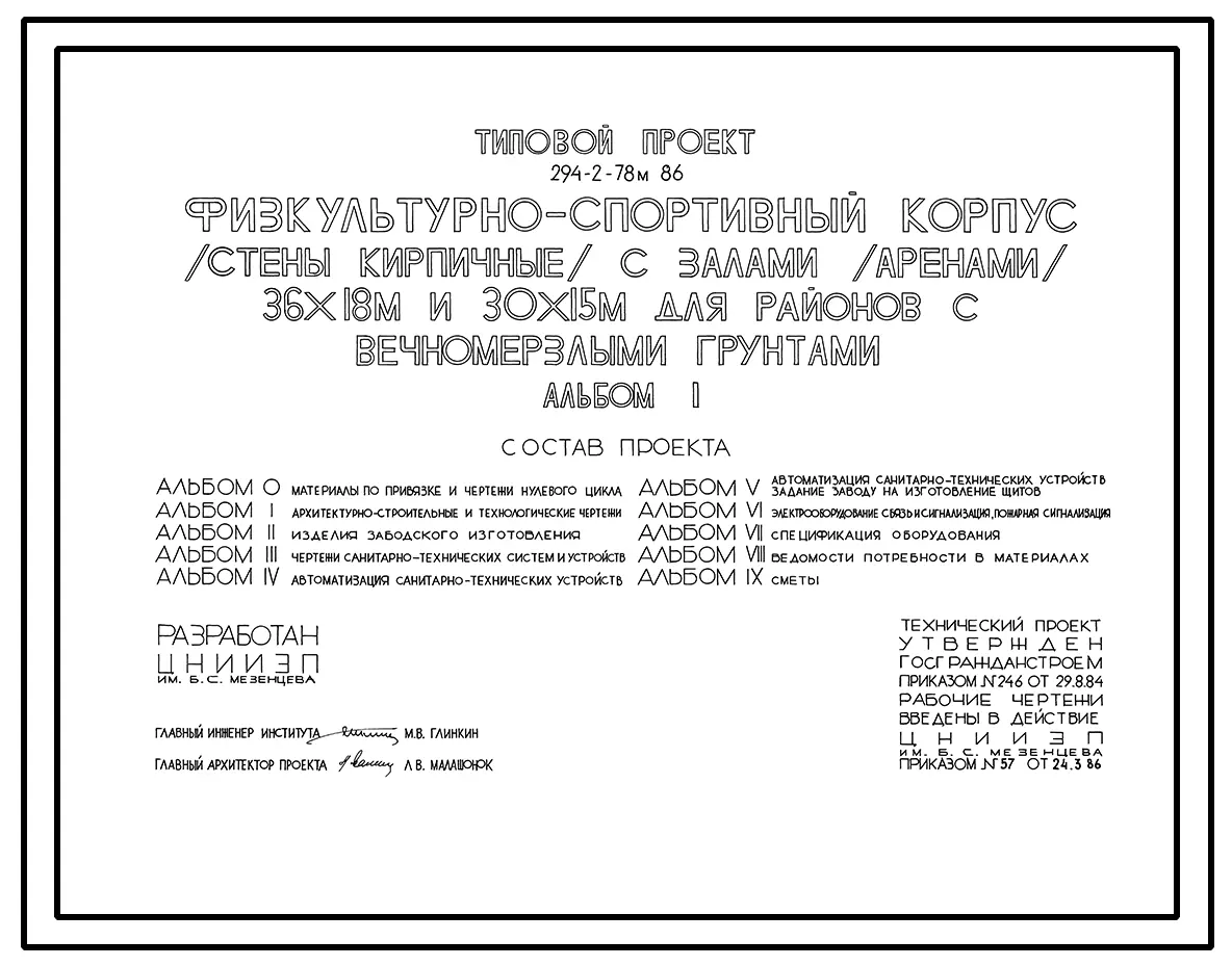 Типовой проект 294-2-78м.86 Физкультурно-спортивный корпус с залом (ареной) 30х18м и 30х15м. Грунты вечномерзлые. Здание двухэтажное. Стены из кирпича.
