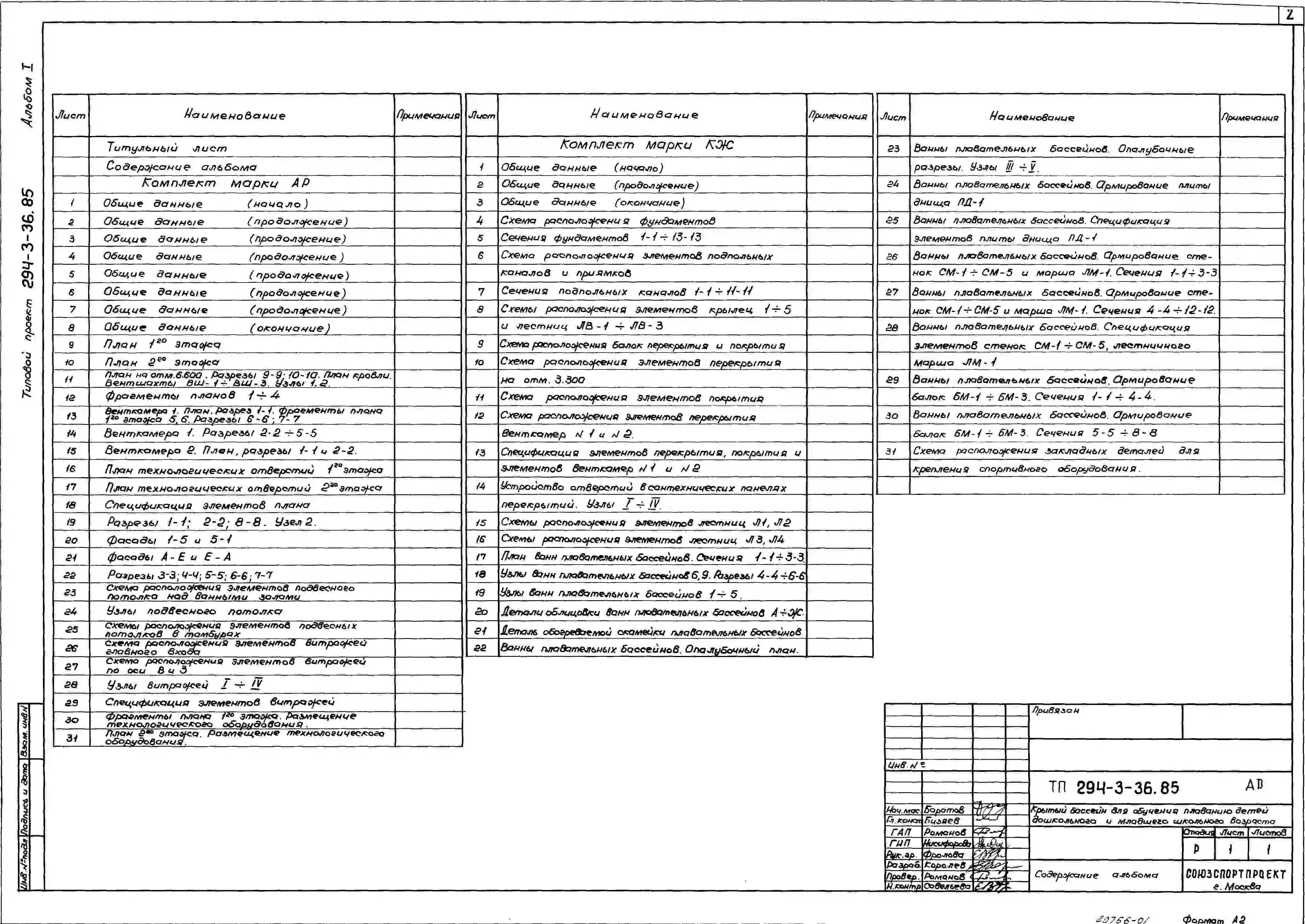 Типовой проект 294-3-36.85 Крытый бассейн для обучения плаванию детей младшего школьного и дошкольного возраста. Здание двухэтажное. Стены из кирпича.