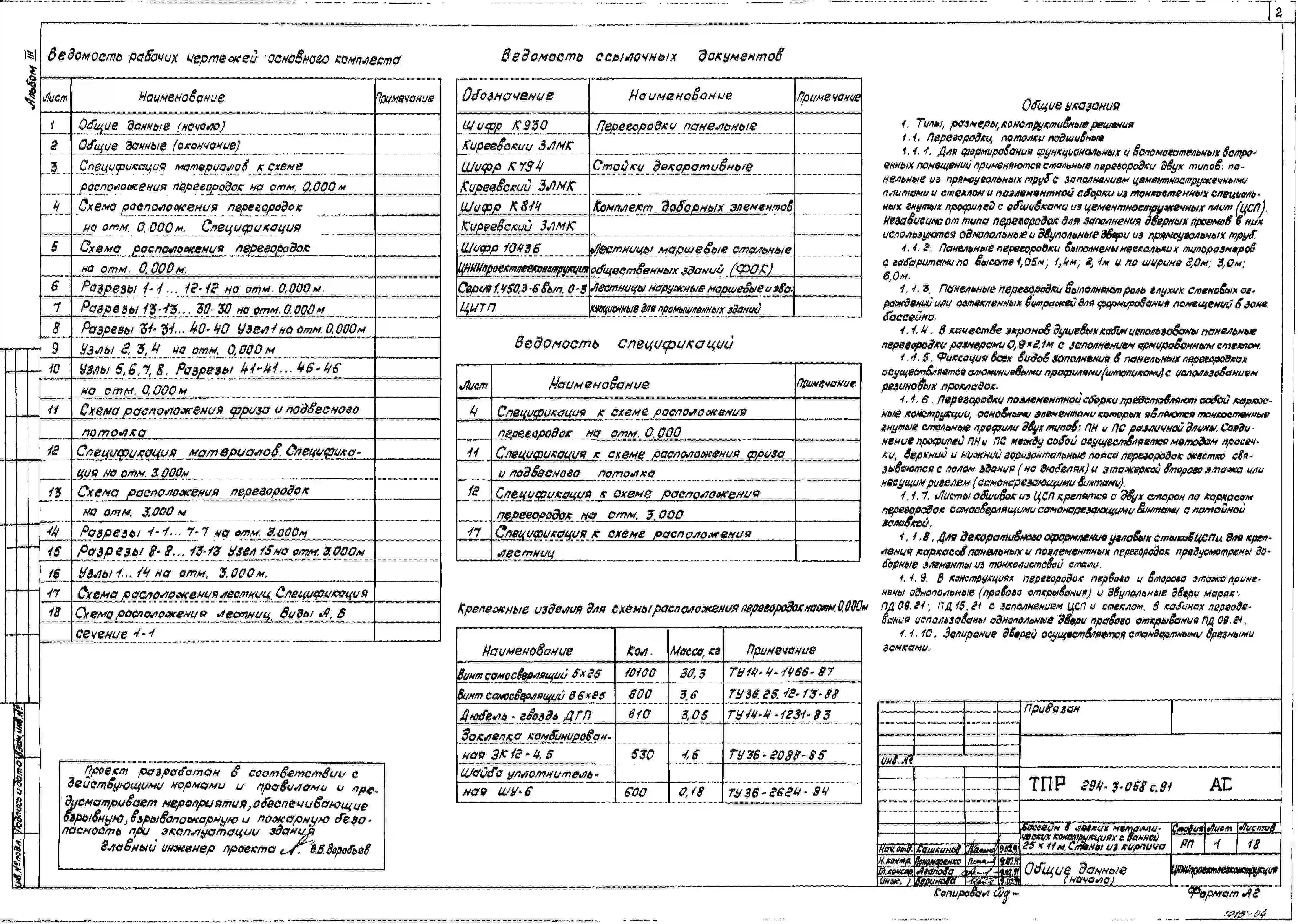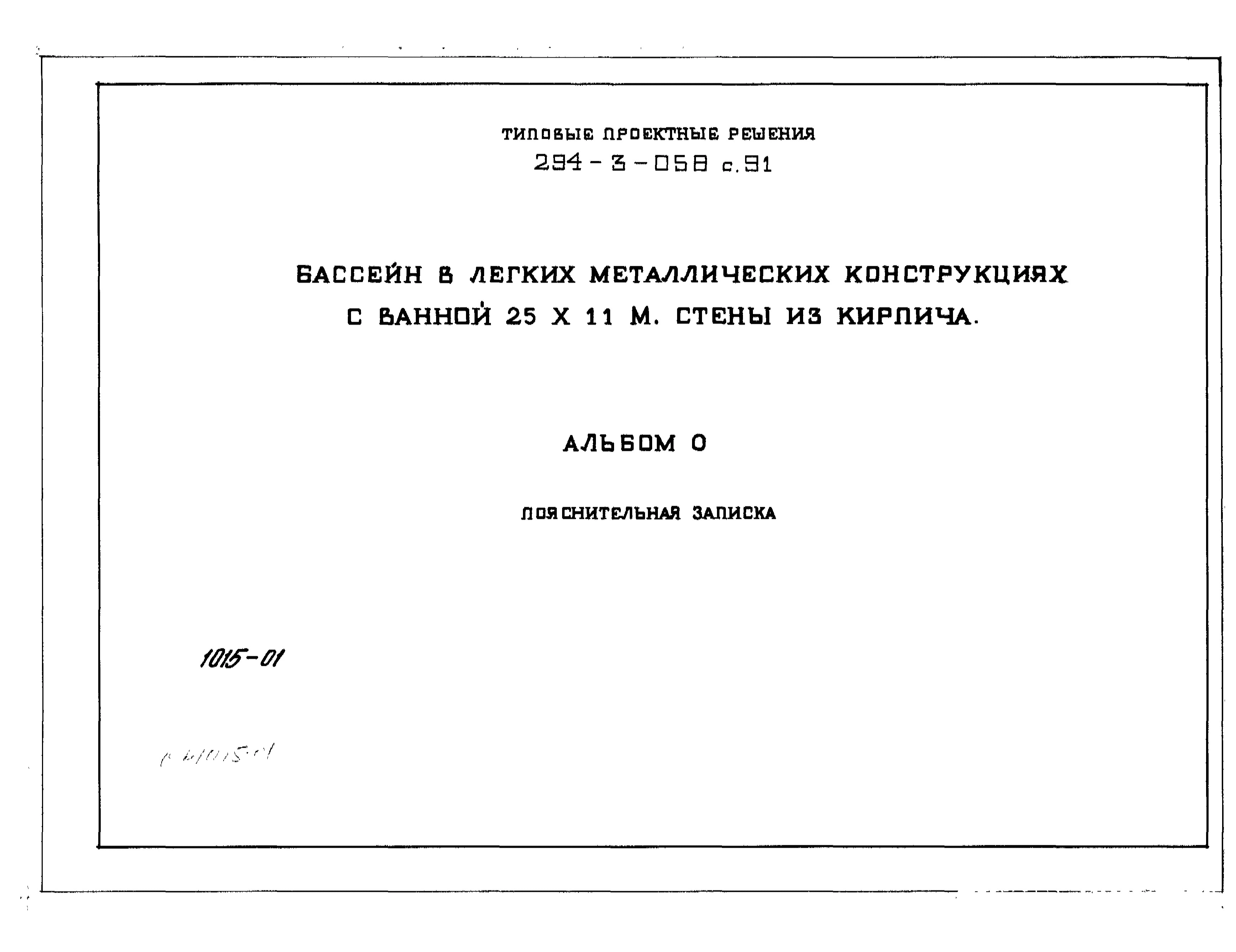 Типовой проект 294-3-058с.91 Бассейн в легких металлических конструкциях с ванной 25х11м. Сейсмичность 7, 8 баллов. Стены из кирпича (варианты – из каркасных и экструзионных панелей).