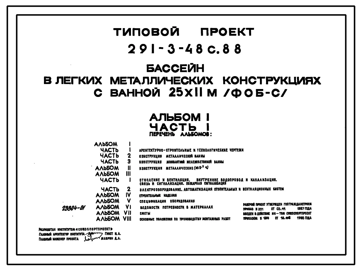 Типовой проект 291-3-48с.88 Бассейн (в легких металлических конструкциях) с ванной 25х11 м (ФОБ-С). Сейсмичность 7, 8, 9 баллов. Стены из трехслойных металлических панелей.