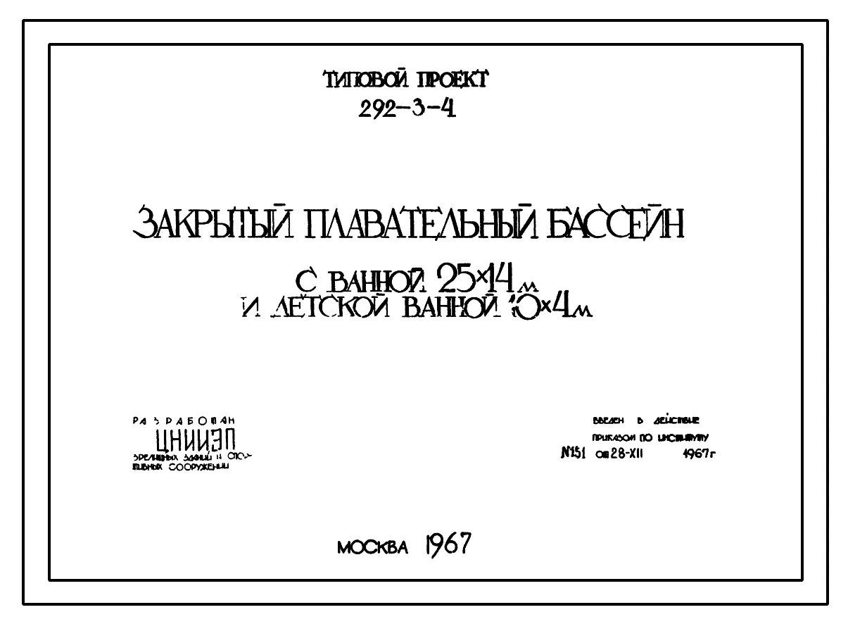 Типовой проект 292-3-4 Закрытый плавательный бассейн с ванной 25х14 м и детской ванной 10х4 м. Для строительства во II и III строительно-климатических зонах.