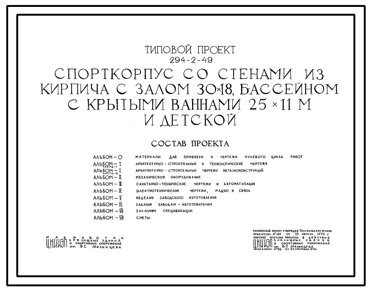 Типовой проект 294-2-49 Спортивный корпус со стенами из кирпича с залом 30х18 м, бассейном с крытыми ваннами 25х11 м и детской.