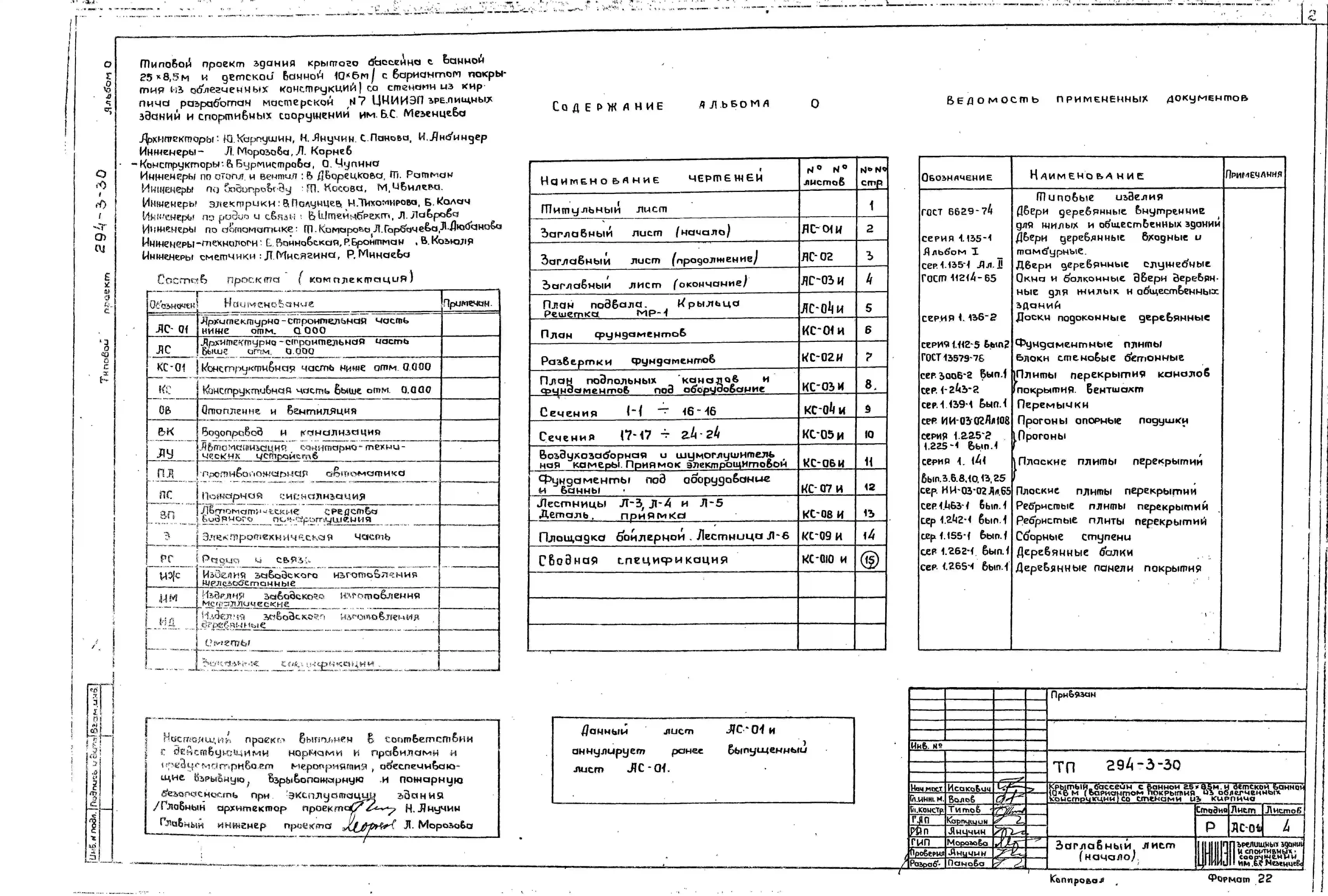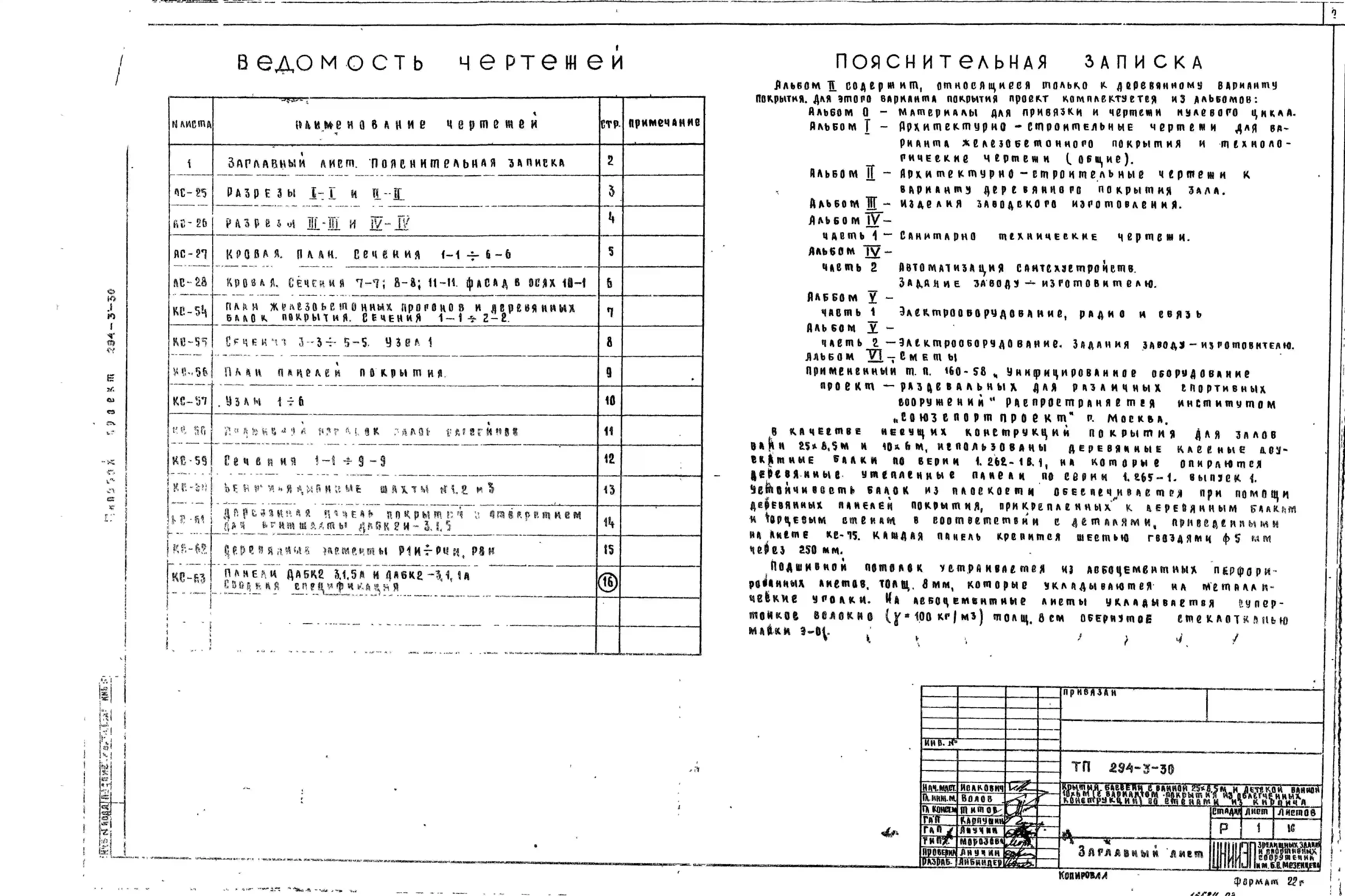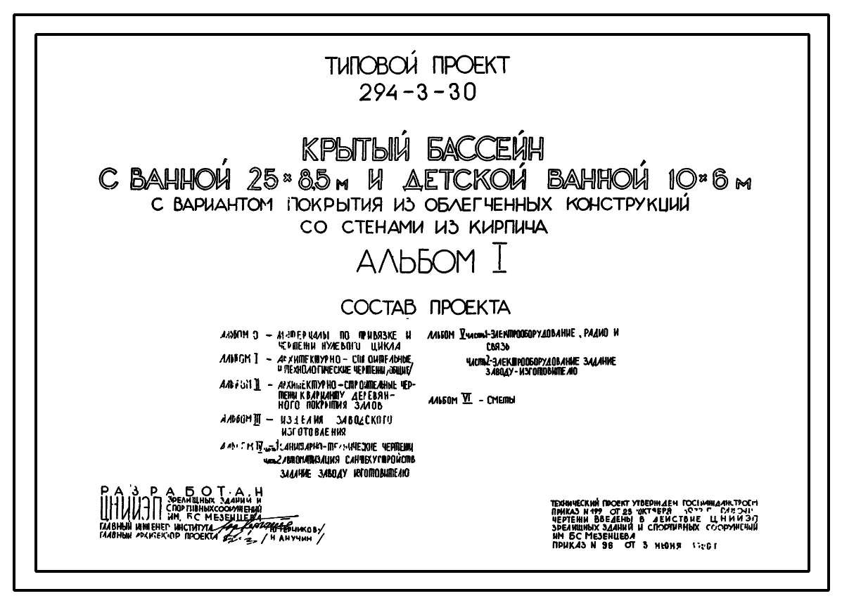Типовой проект 294-3-30 Крытый бассейн с ванной 25х8,5 м и детской ванной 10х6 м. Для строительства в 1В климатическом подрайоне, 2 и 3 климатических районах Полный исходный проект.