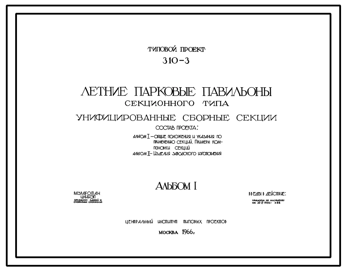 Типовой проект 310-3 Летние парковые павильоны секционного типа для строительства во 2 и 3 строительно-климатических зонах. Унифицированные сборные секции.