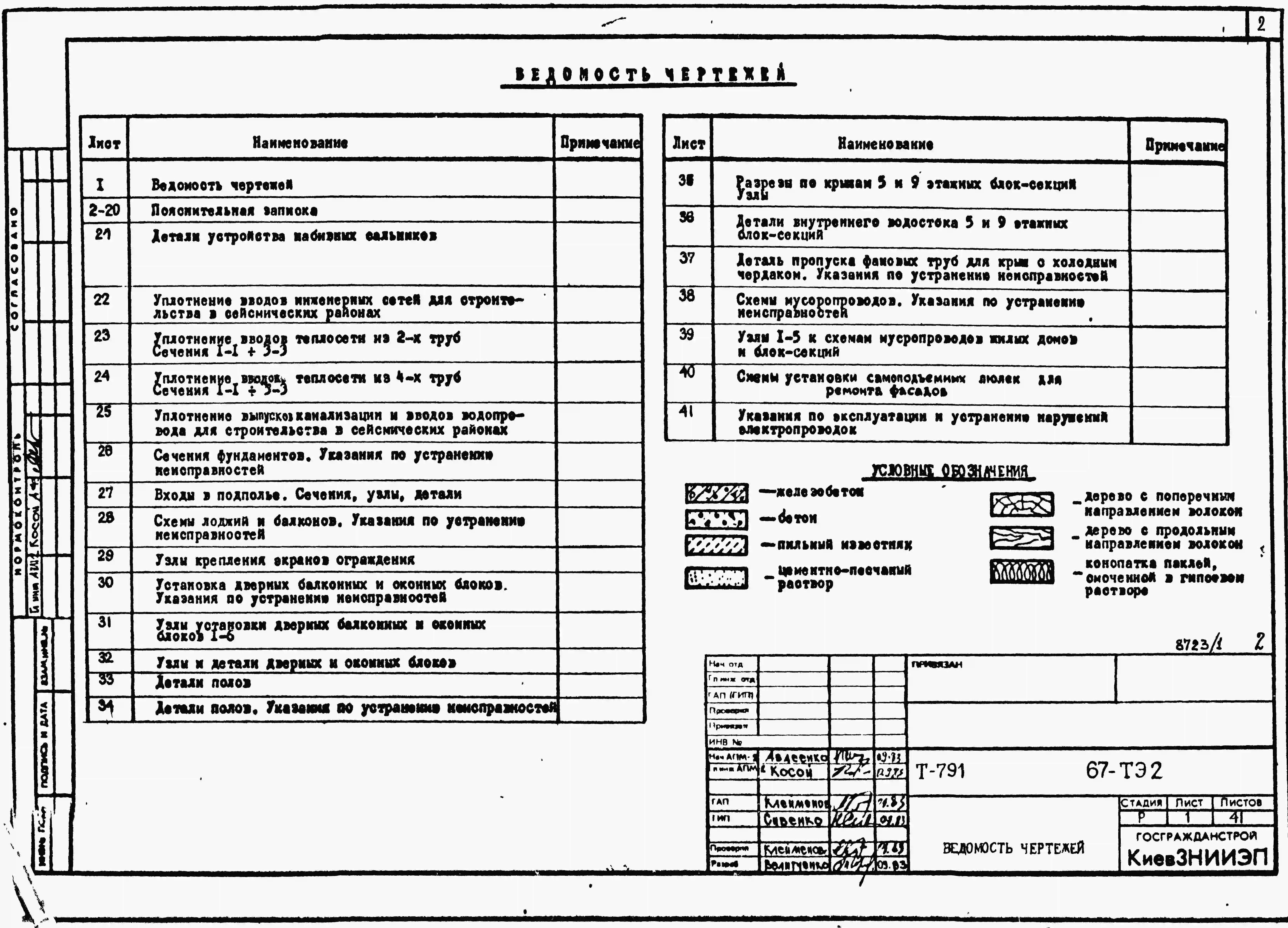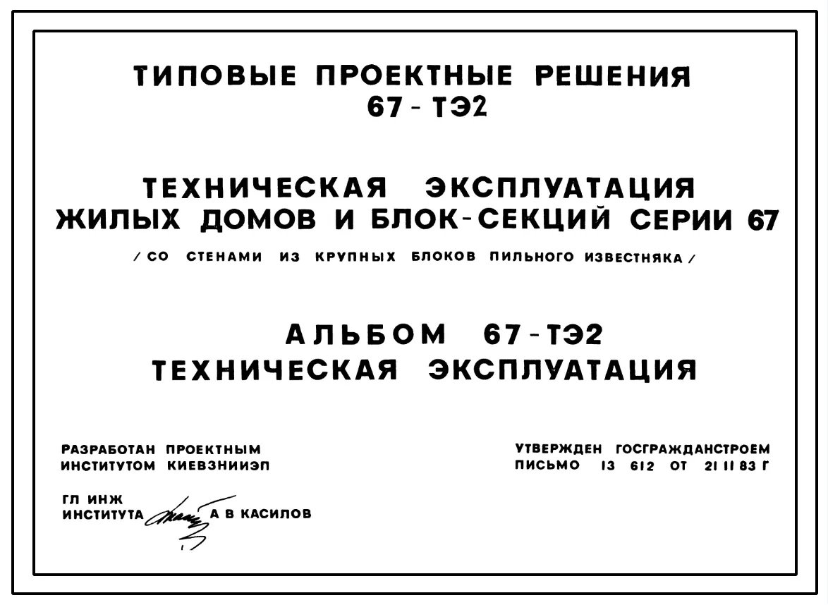 Типовой проект 67-ТЭ2 Техническая эксплуатация жилых домов и блок-секция серии 67 (со стенами из крупных блоков пильного известняка). Паспорт проекта (формат PDF) Чертежи (формат TIF)