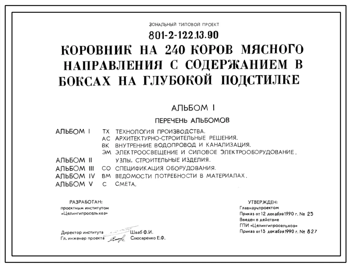Типовой проект 801-2-122.13.90 Коровник на 240 коров мясного направления с содержанием в боксах на глубокой подстилке. Для районов Сибири и Южного Урала. Содержание беспривязное в секциях, оборудованных боксами. Раздача кормов – мобильная. Удаление навоза