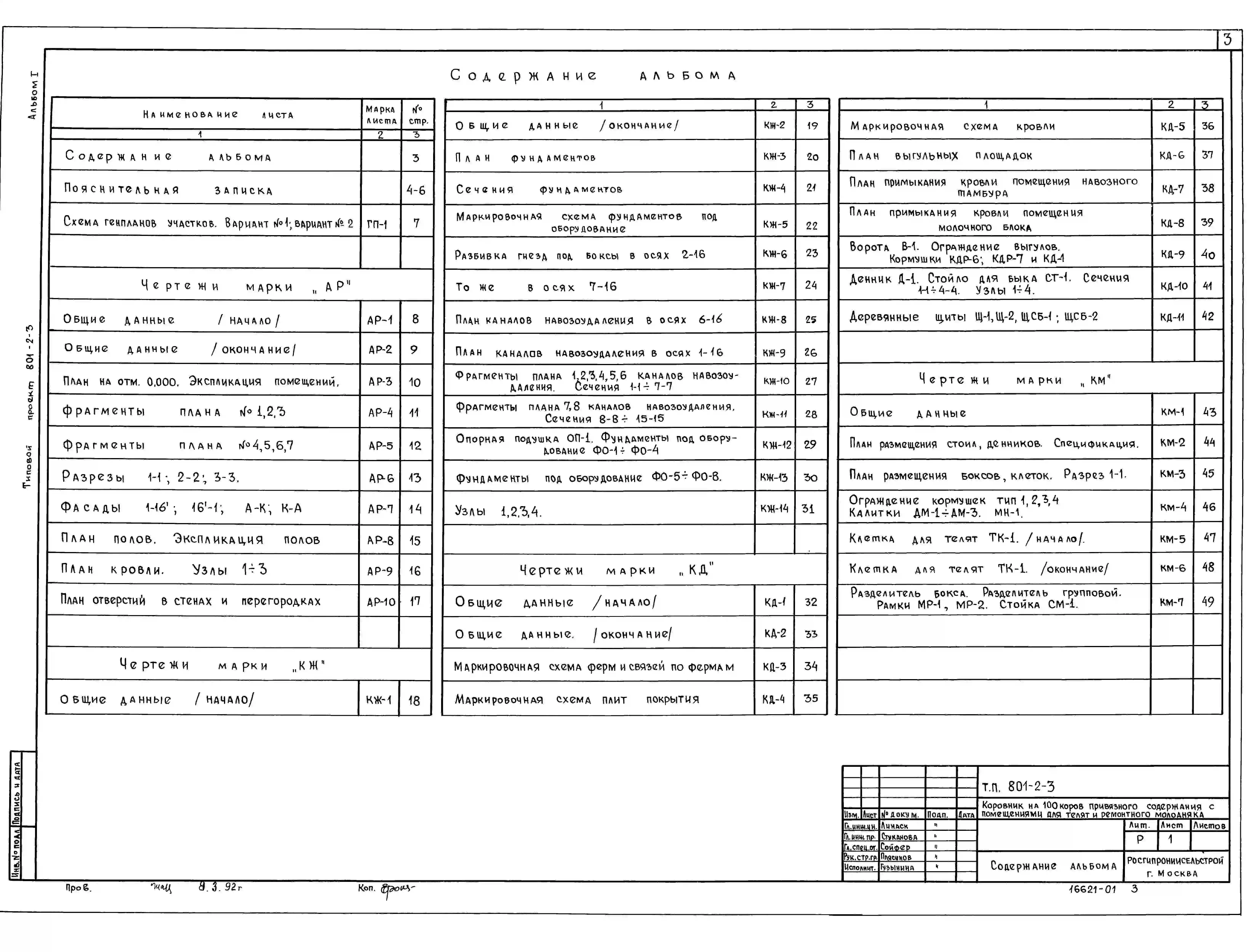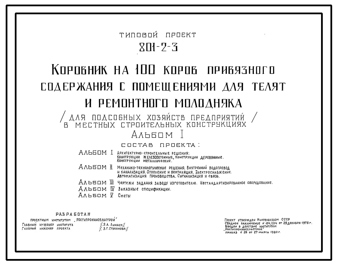 Типовой проект 801-2-3 Коровник на 100 коров привязного содержания с помещениями для телят и ремонтного молодняка (для подсобных хозяйств предприятий). Содержание молодняка - в групповых клетках с боксами Доение коров - в доильные ведра. Раздача кормов –