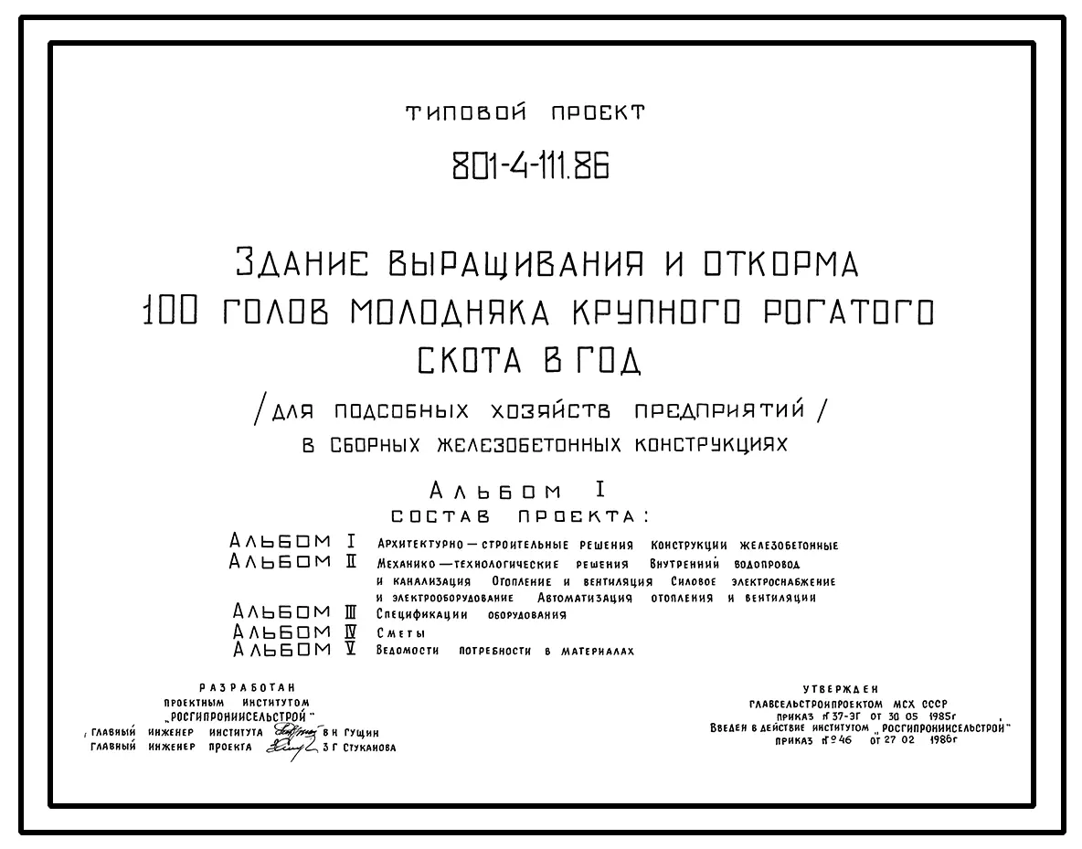 Типовой проект 801-4-111.86 Здание выращивания и откорма 100 голов молодняка крупного рогатого скота в год (для подсобных хозяйств предприятий). Содержание от 4 до 18 месяцев - в клетках с боксами. Раздача кормов – мобильная. Удаление навоза - скреперной