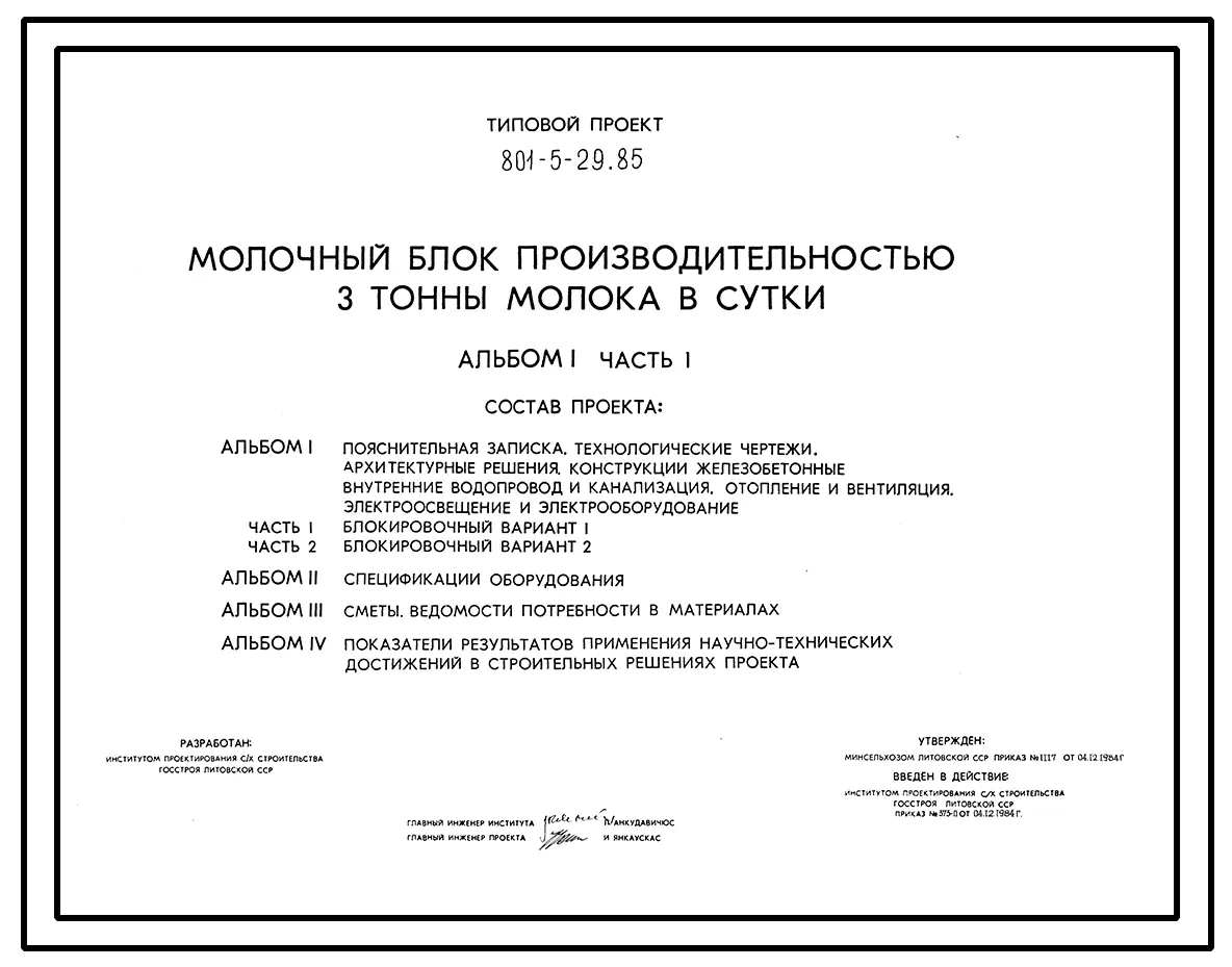 Типовой проект 801-5-29.85 Молочный блок производительностью 3 т молока в сутки