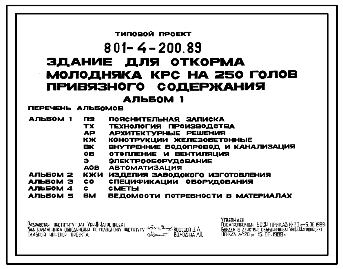 Типовой проект 801-4-200.89 ЗДАНИЕ ДЛЯ ОТКОРМА МОЛОДНЯКА КРС НА 250 ГОЛОВ ПРИВЯЗНОГО СОДЕРЖАНИЯ.
