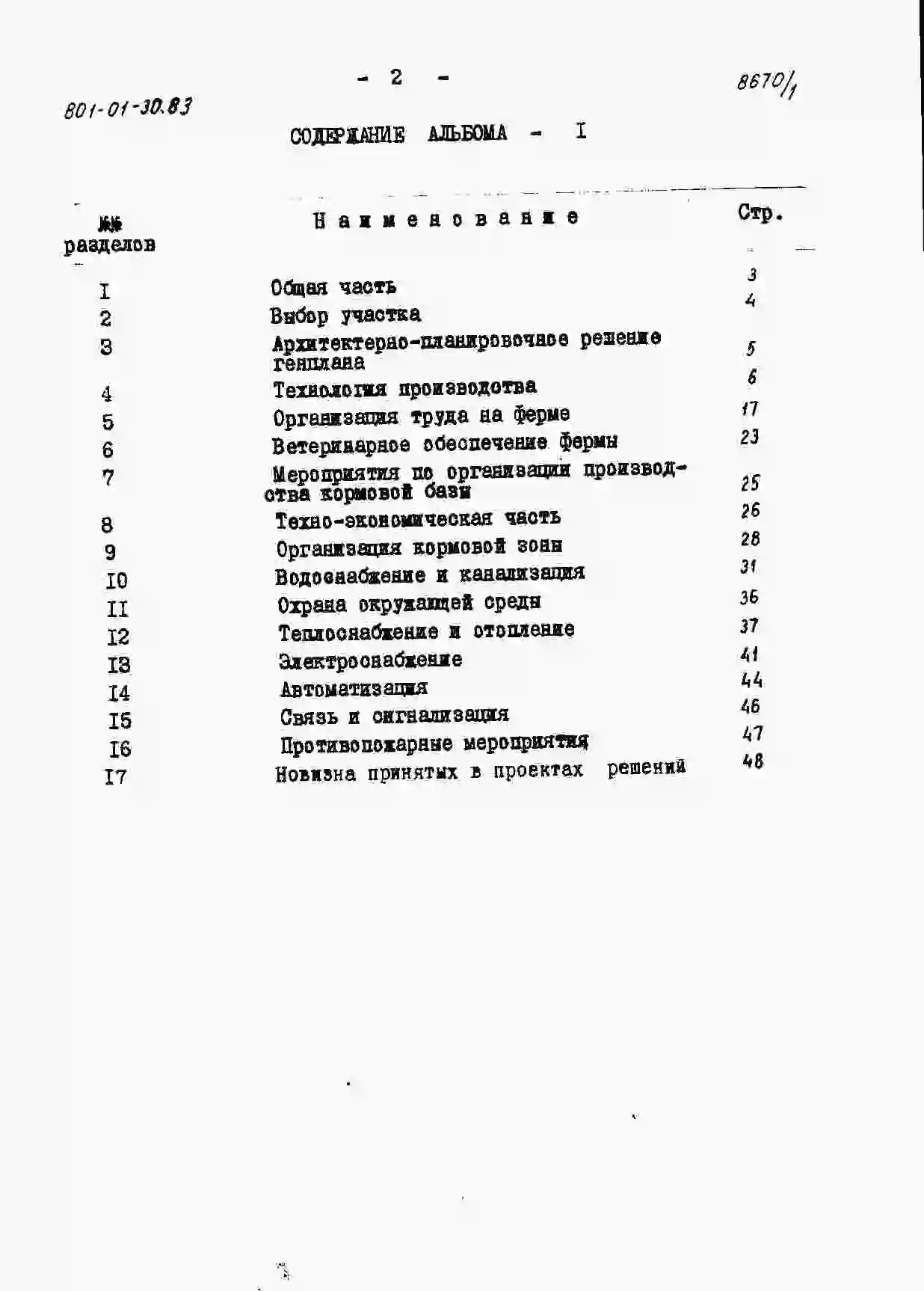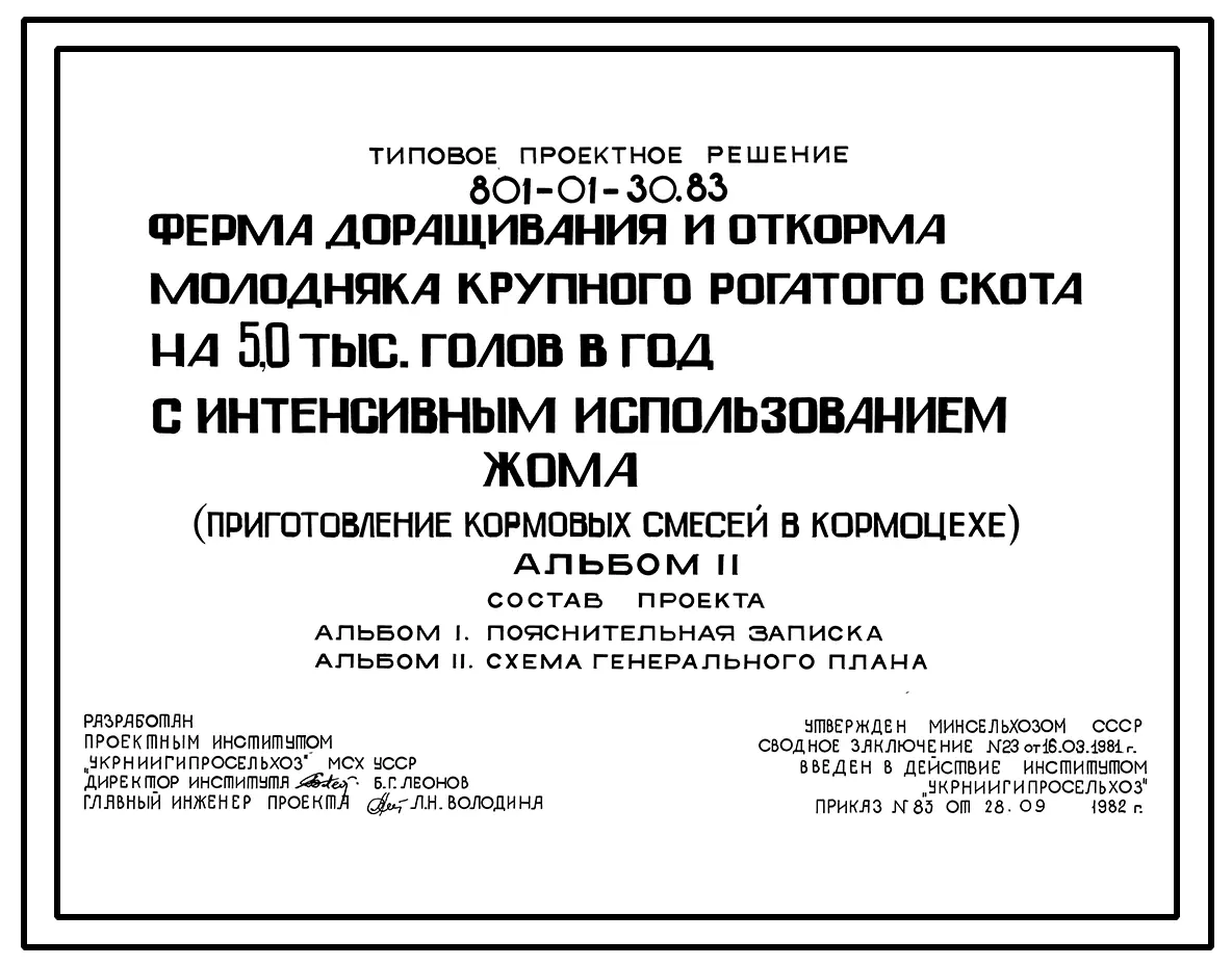 Типовой проект 801-01-30.83 Ферма доращивания и откорма молодняка крупного рогатого скота 5,0 тыс голов в год с интенсивным использованием жома (приготовление кормовых смесей в кормоцехе)
