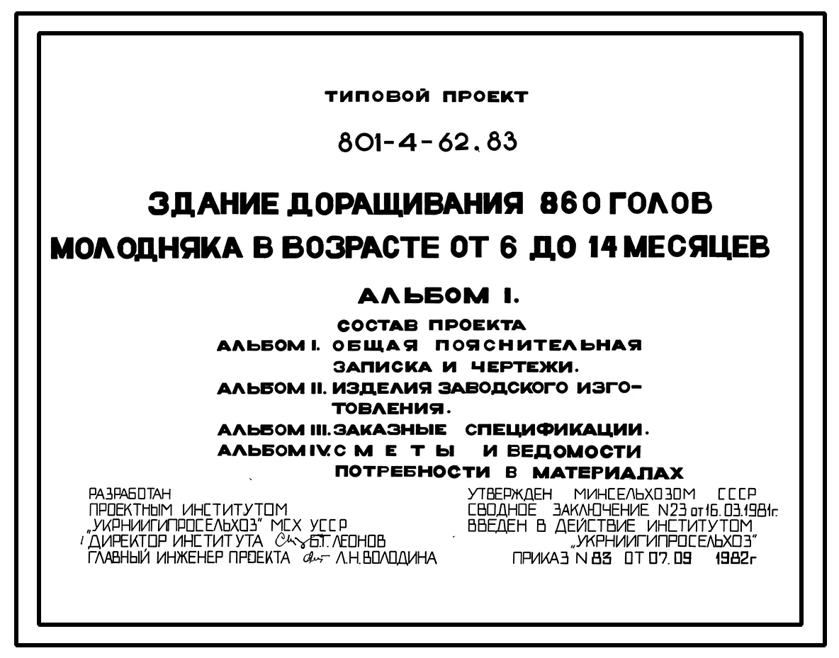 Типовой проект 801-4-62.83 Здание доращивания 860 голов молодняка КРС в возрасте от 6 до 14 месяцев