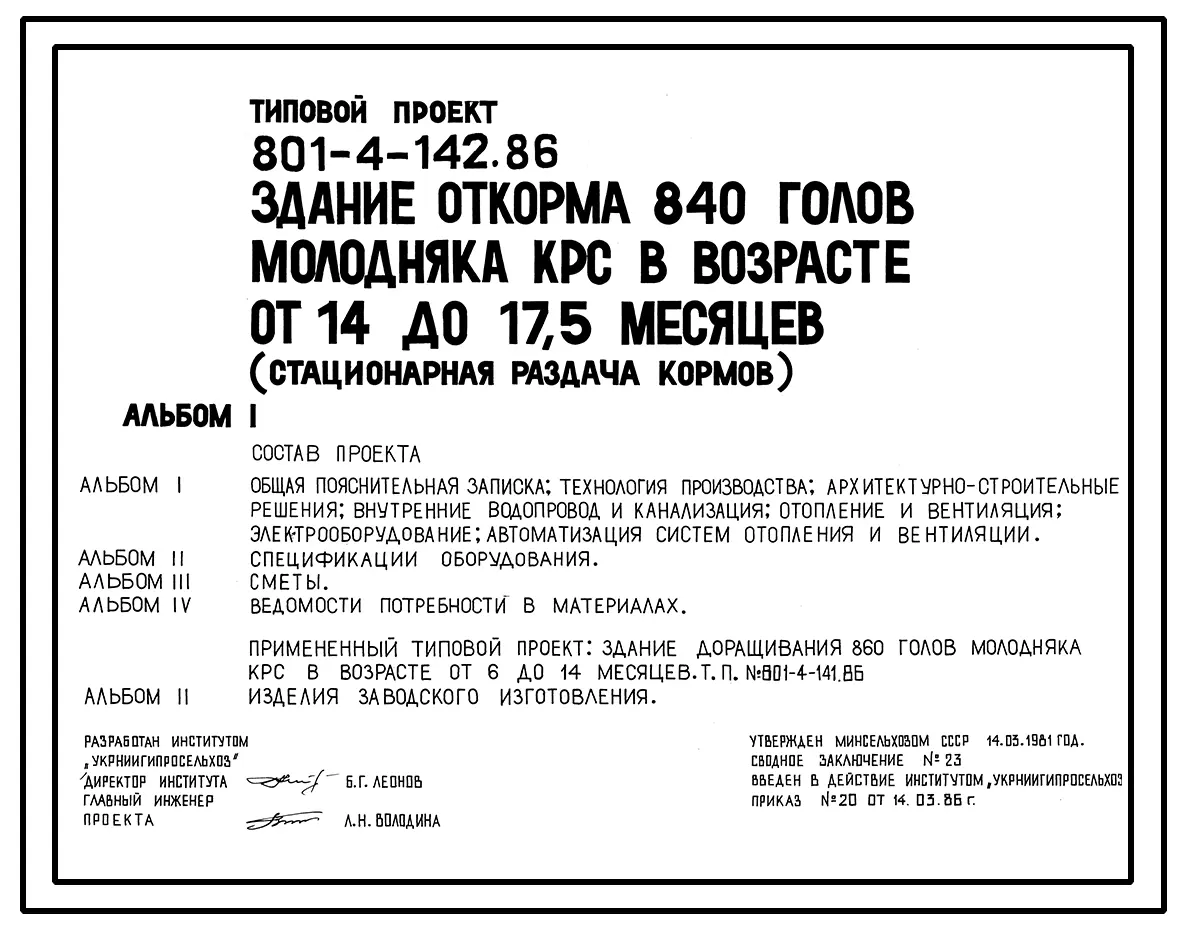 Типовой проект 801-4-142.86 Здание откорма 840 голов молодняка КРС в возрасте от 14 до 17,5 месяцев (стационарная раздача кормов). Содержание в секциях с групповыми клетками. Удаление навоза самотечное