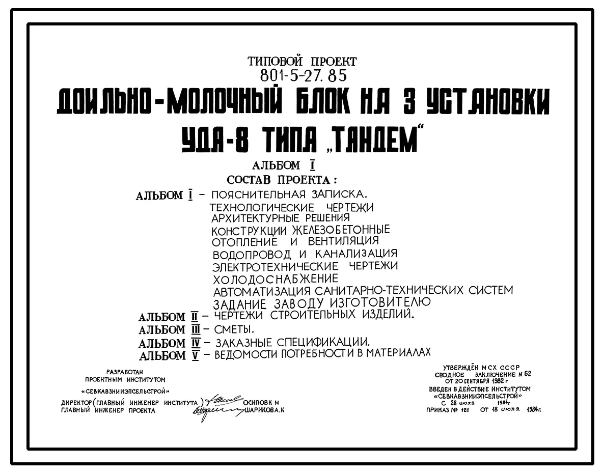Типовой проект 801-5-27.85 Доильно-молочный блок на 3 установки УДТ-8 типа «Тандем»