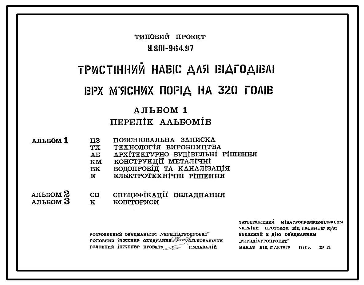 Типовой проект У.801-9-64.97 Трехстенный навес для откорма КРС мясных пород на 320 голов (украинский язык)