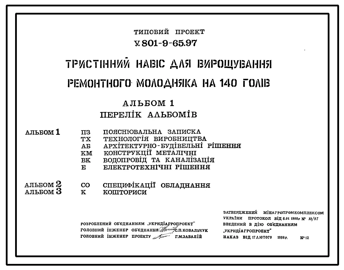 Типовой проект У.801-9-65.97 Трехстенный навес для выращивания ремонтного молодняка на 140 голов (украинский язык)