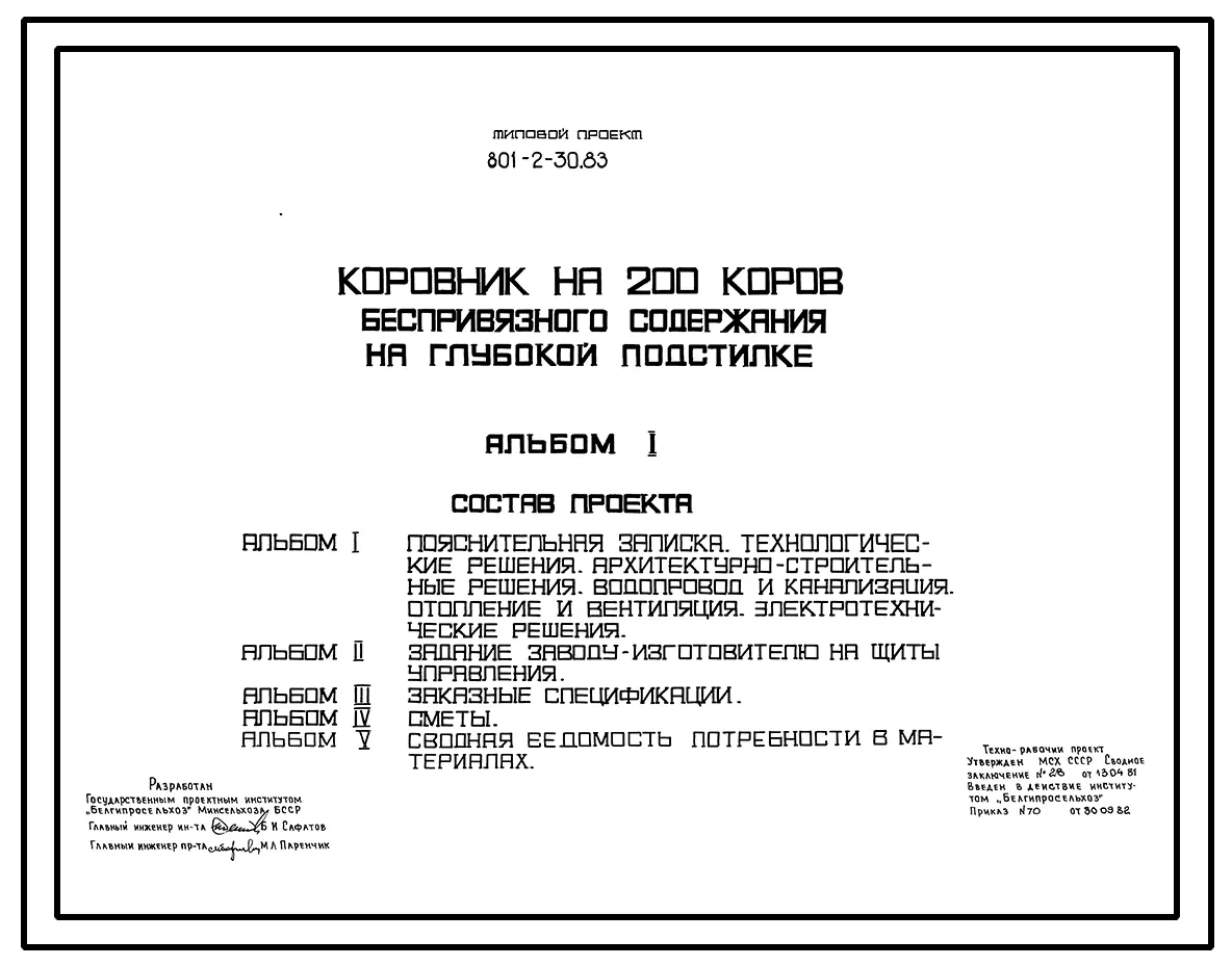 Типовой проект 801-2-30.83 Коровник на 200 коров беспривязного содержания на глубокой подстилке