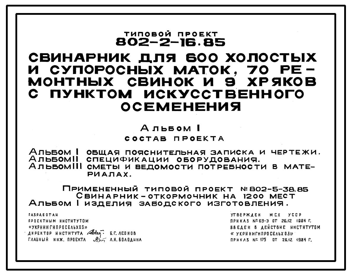Типовой проект 802-2-16.85 Свинарник на 600 холостых и супоросных маток, 70 ремонтных свинок и 9 хряков с пунктом их искусственного осеменения
