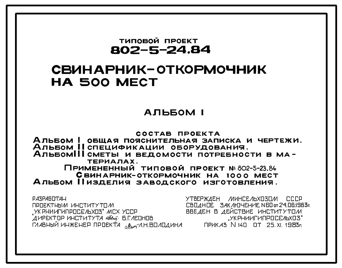 Типовой проект 802-5-24.84 Свинарник-откормочник на 500 мест