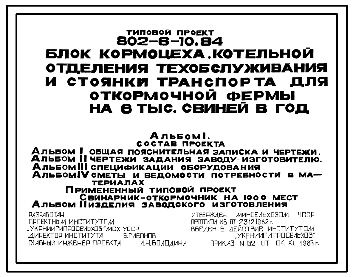 Типовой проект 802-6-10.84 Блок кормоцеха, котельной, отделения техобслуживания и стоянки транспорта фермы откорма 6 тыс. свиней в год