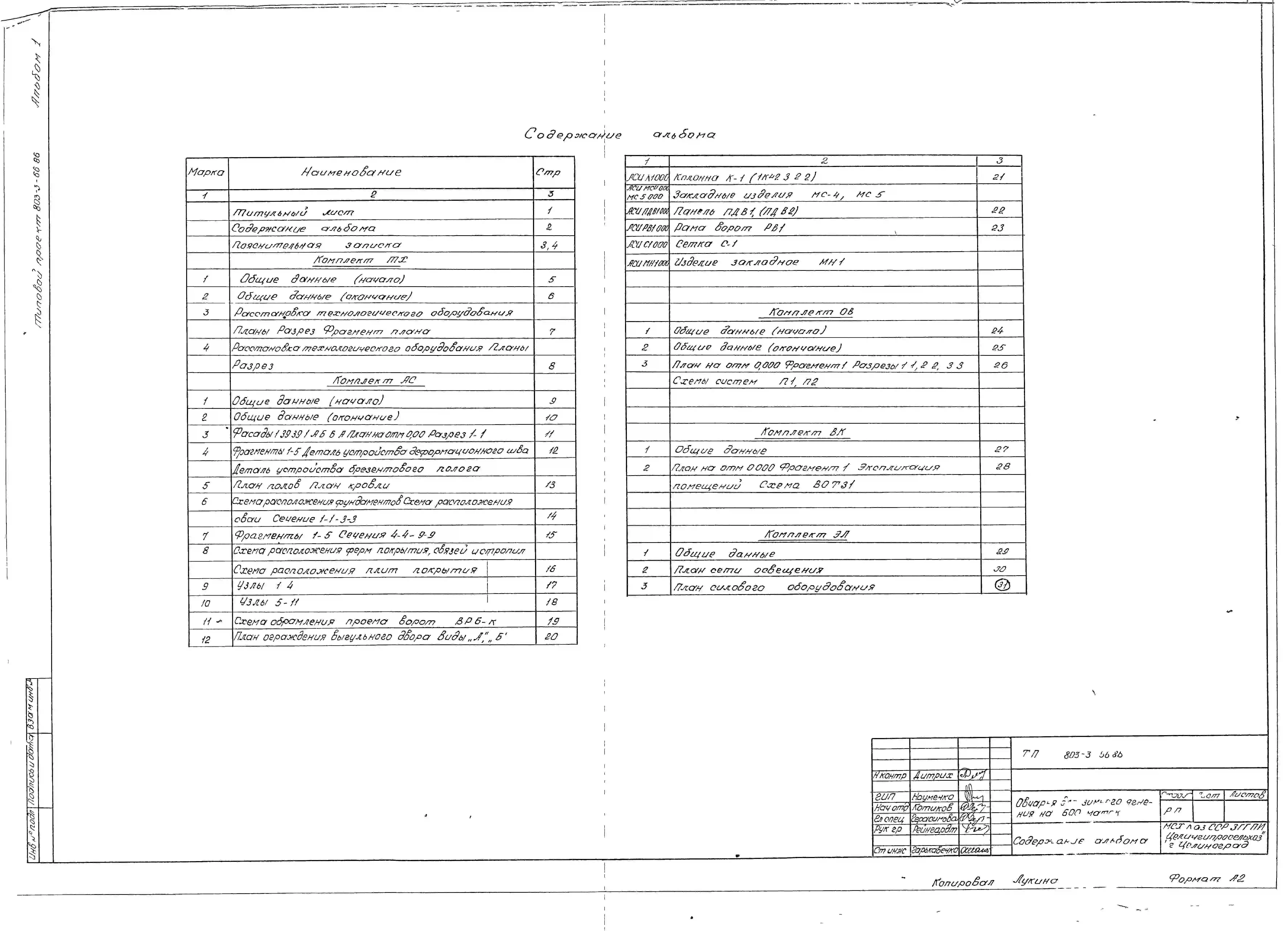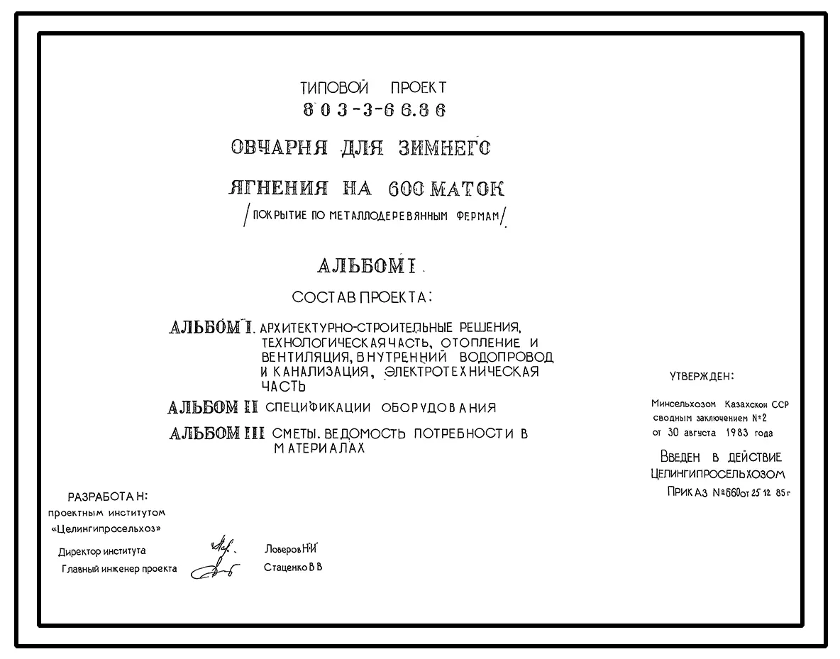 Типовой проект 803-3-66.86 Овчарня для зимнего ягнения на 600 маток (покрытие по металлодеревянным фермам)