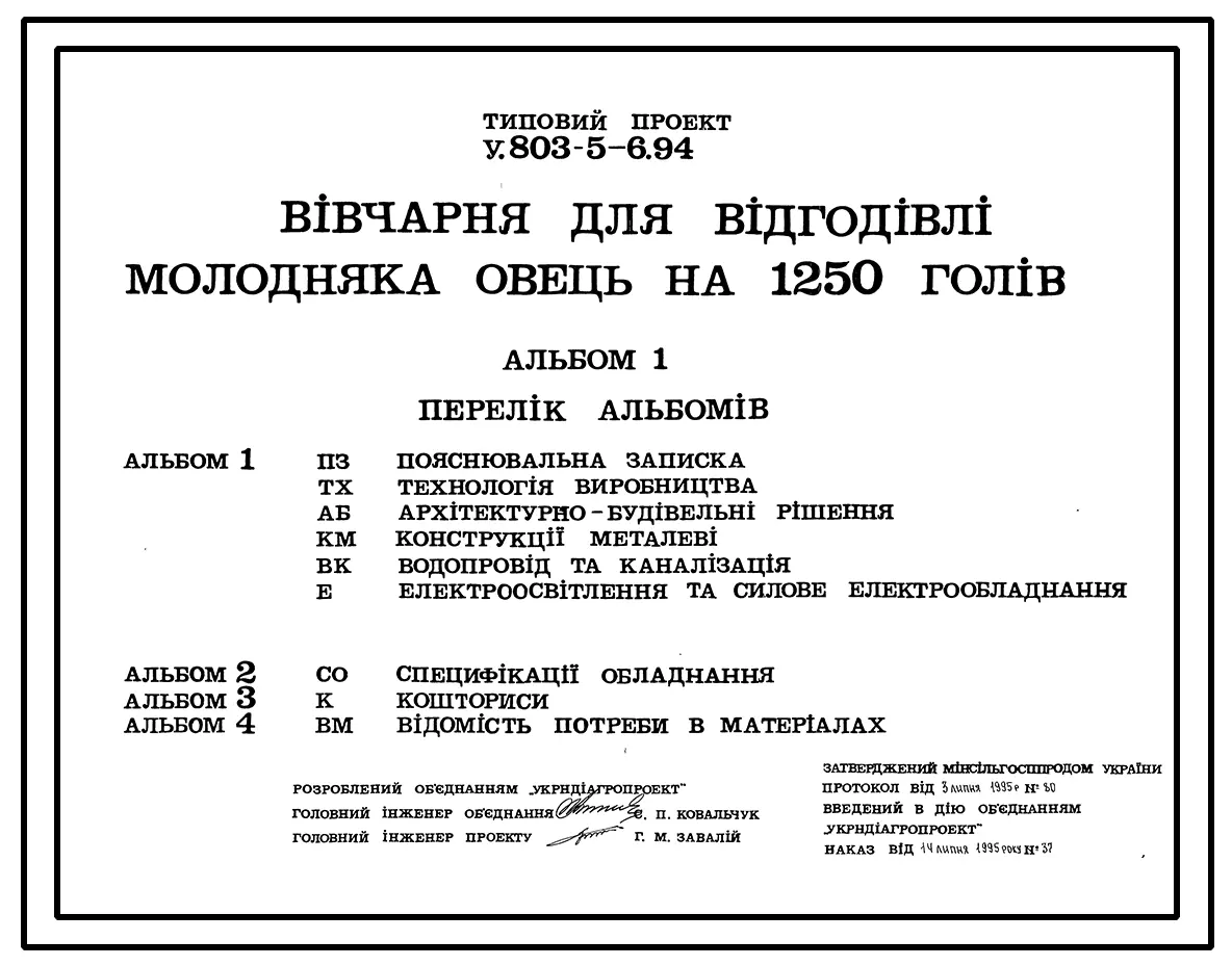 Типовой проект У.803-5-6.94 Овчарня для откорма молодняка овец на 1250 голов (украинский язык)