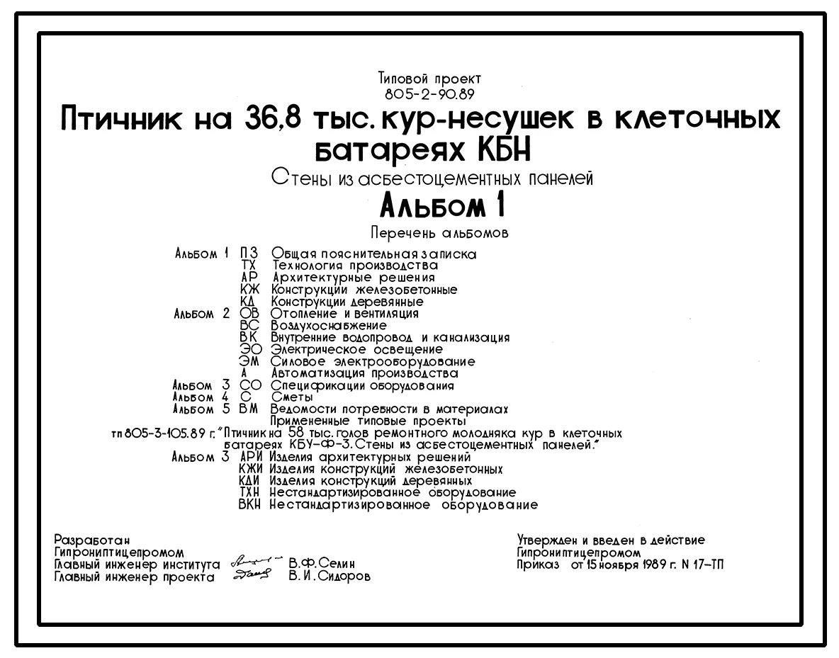 Типовой проект 805-2-90.89 Птичник на 36,8 тыс. кур-несушек в клеточных батареях КБН. Размеры здания - 18x96 м. Расчетная температура: -30°С. Стены - панельные асбестоцементные. Покрытие - асбестоцементные плиты по металлическим фермам