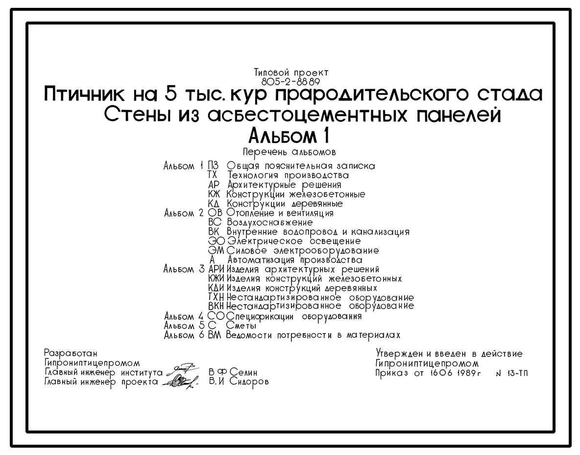 Типовой проект 805-2-88.89 Птичник на 5 тыс. кур прародительского стада. Птица содержится на глубокой подстилке с применением комплекта оборудования КМК-18. Размеры здания - 18x84 м. Расчетная температура: -30°С. Стены - панельные асбестоцементные. Покрыт