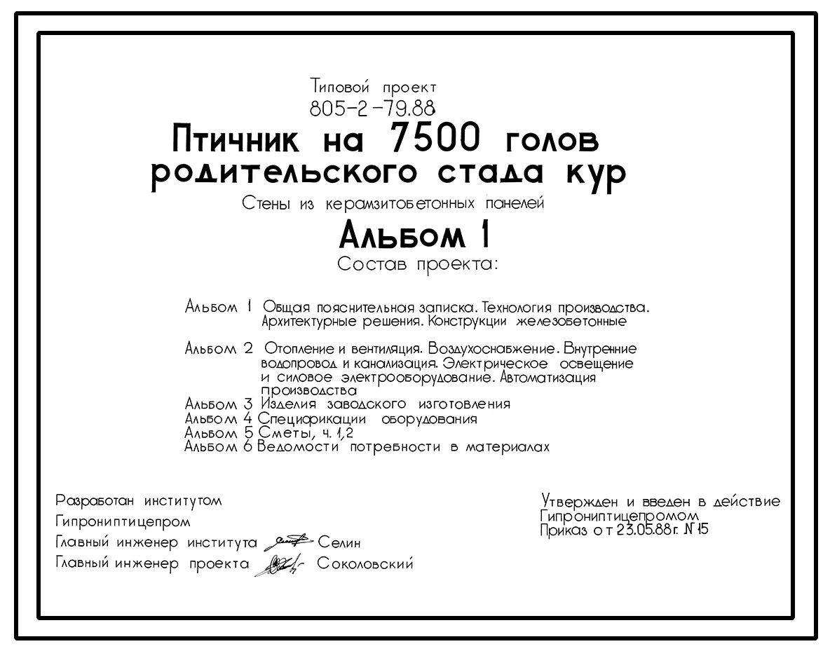 Типовой проект 805-2-79.88 Птичник на 7,5 тыс. голов родительского стада кур. Птица содержится на глубокой подстилке с применением комплекта оборудования КМК-18. Размеры здания -18x96 м. Расчетная температура: -20, -30, -40°С. Стены - панельные