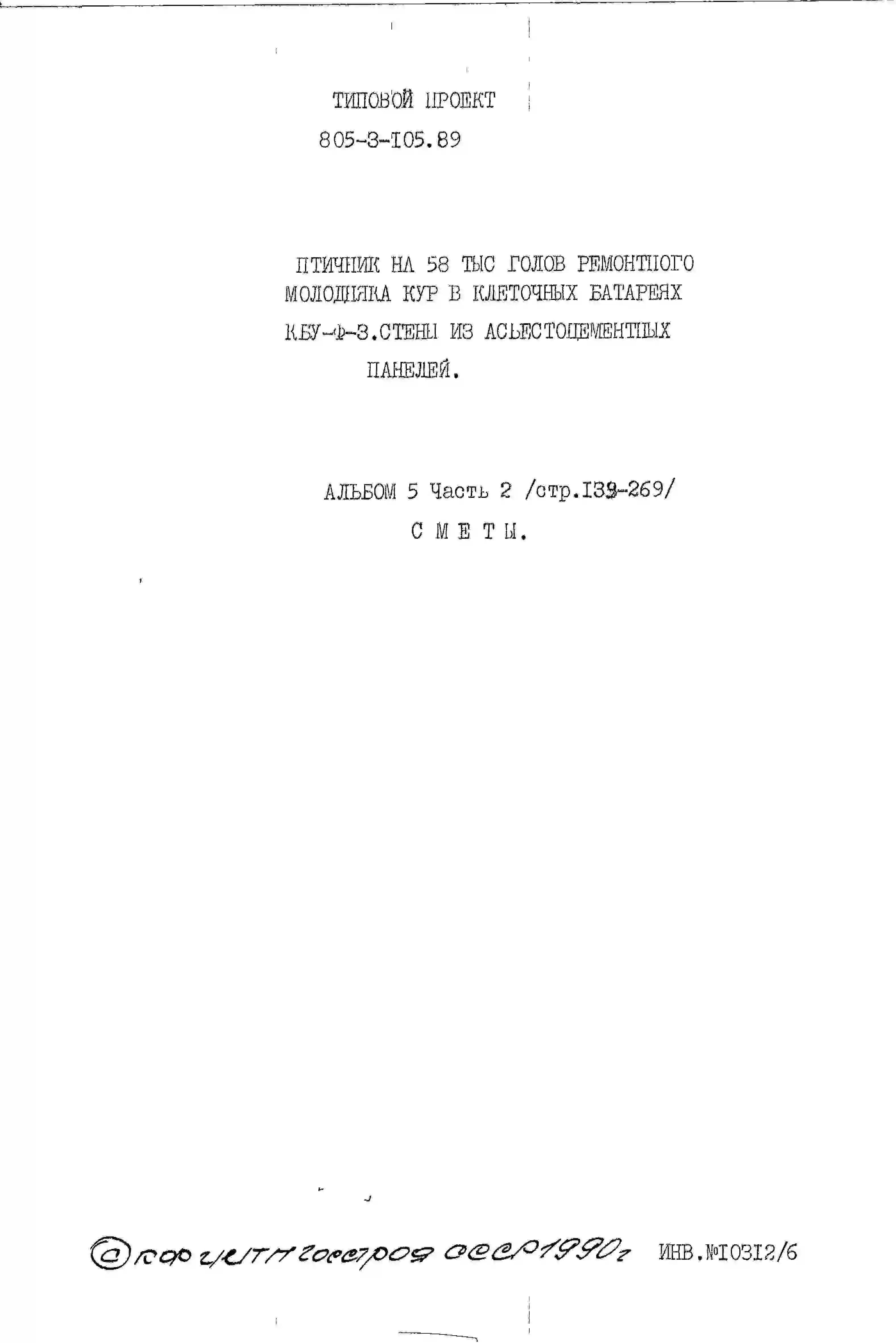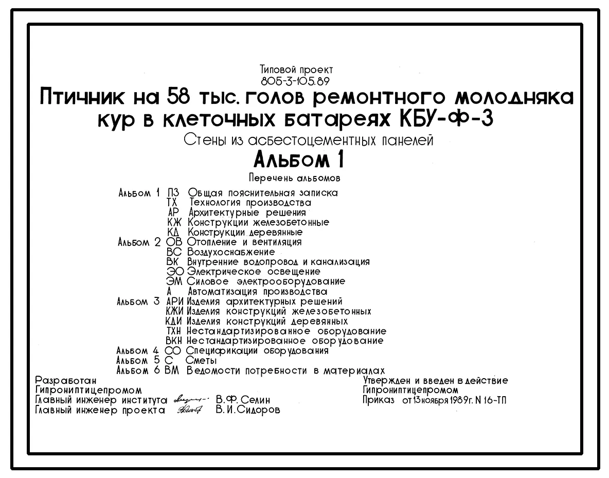 Типовой проект 805-3-105.89 Птичник на 58 тыс. голов ремонтного молодняка кур в клеточных батареях КБУ-Ф-3. Размеры здания - 18x96 м. Расчетная температура: -30°С. Стены - панельные асбестоцементные. Покрытие - асбестоцементные плиты по металлическим ферм
