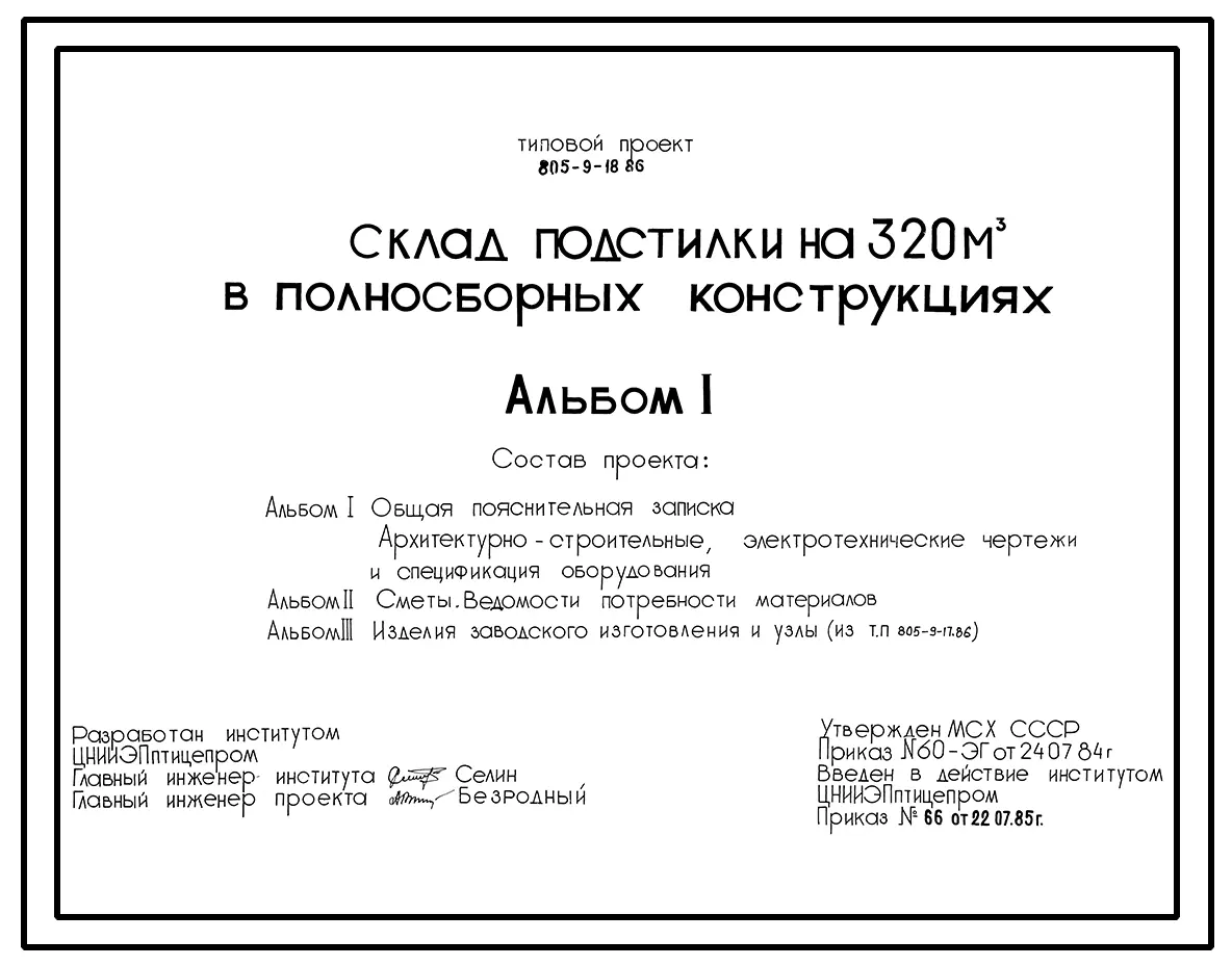 Типовой проект 805-9-18.86 Склад подстилки на 320 м3. Предназначен для хранения подстилки, используемой в птичниках с напольным содержанием. Размеры здания - 12x18 м. Расчетная температура: -30°С. Стены - панельные железобетонные. Покрытие - асбестоцемент