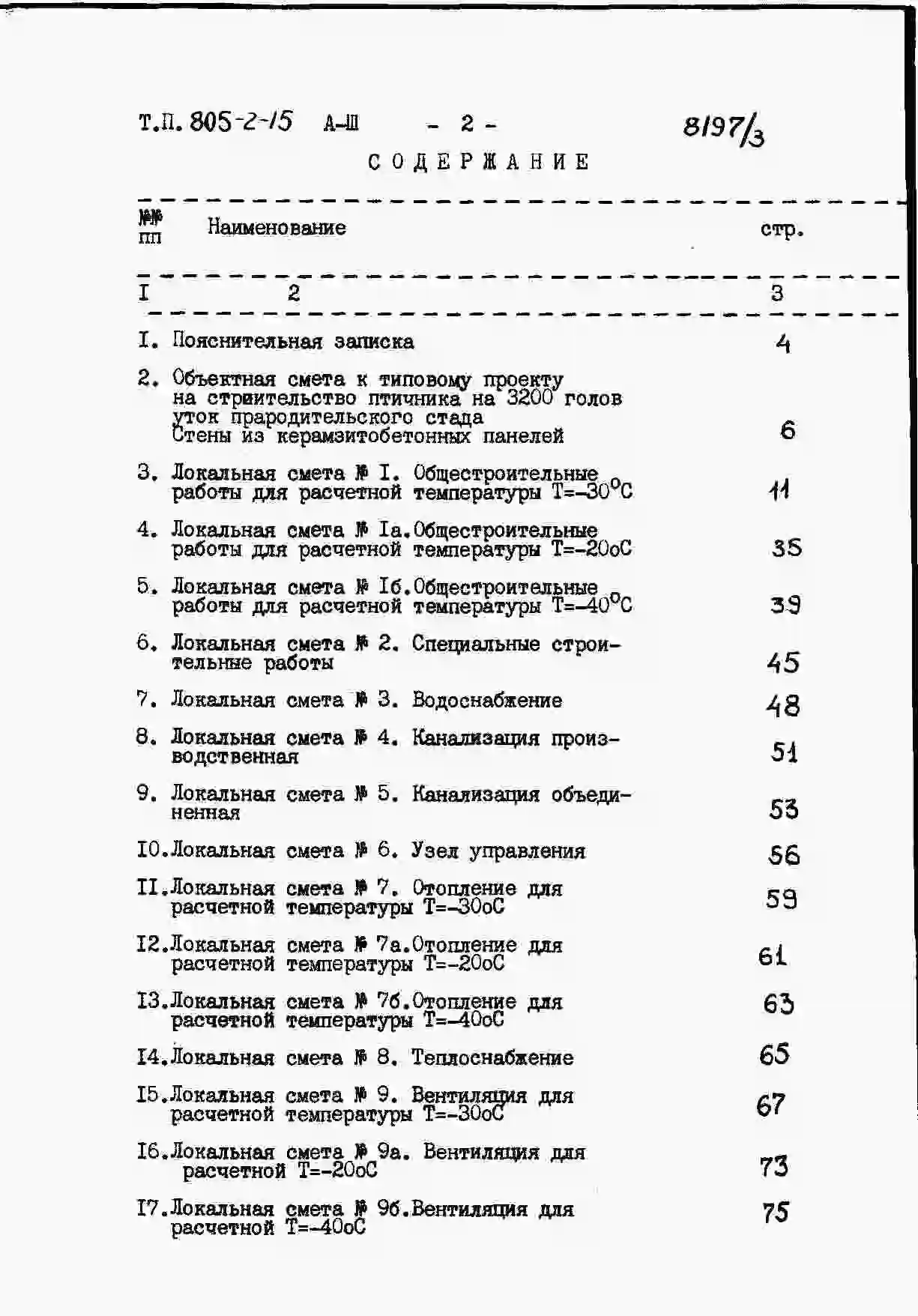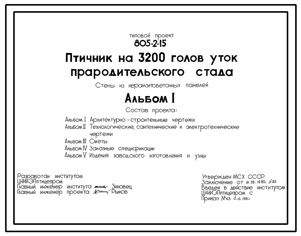 Типовой проект 805-2-15 ПТИЧНИК НА 3200 ГОЛОВ УТОК ПРАРОДИТЕЛЬСКОГО СТАДА. СТЕНЫ ИЗ КЕРАМЗИТОБЕТОННЫХ ПАНЕЛЕЙ.