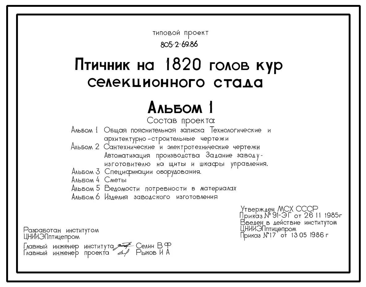 Типовой проект 805-2-69.86 Птичник на 1820 голов кур селекционного стада. Содержание птицы на глубокой подстилке с применением комплекта оборудования КМК-12