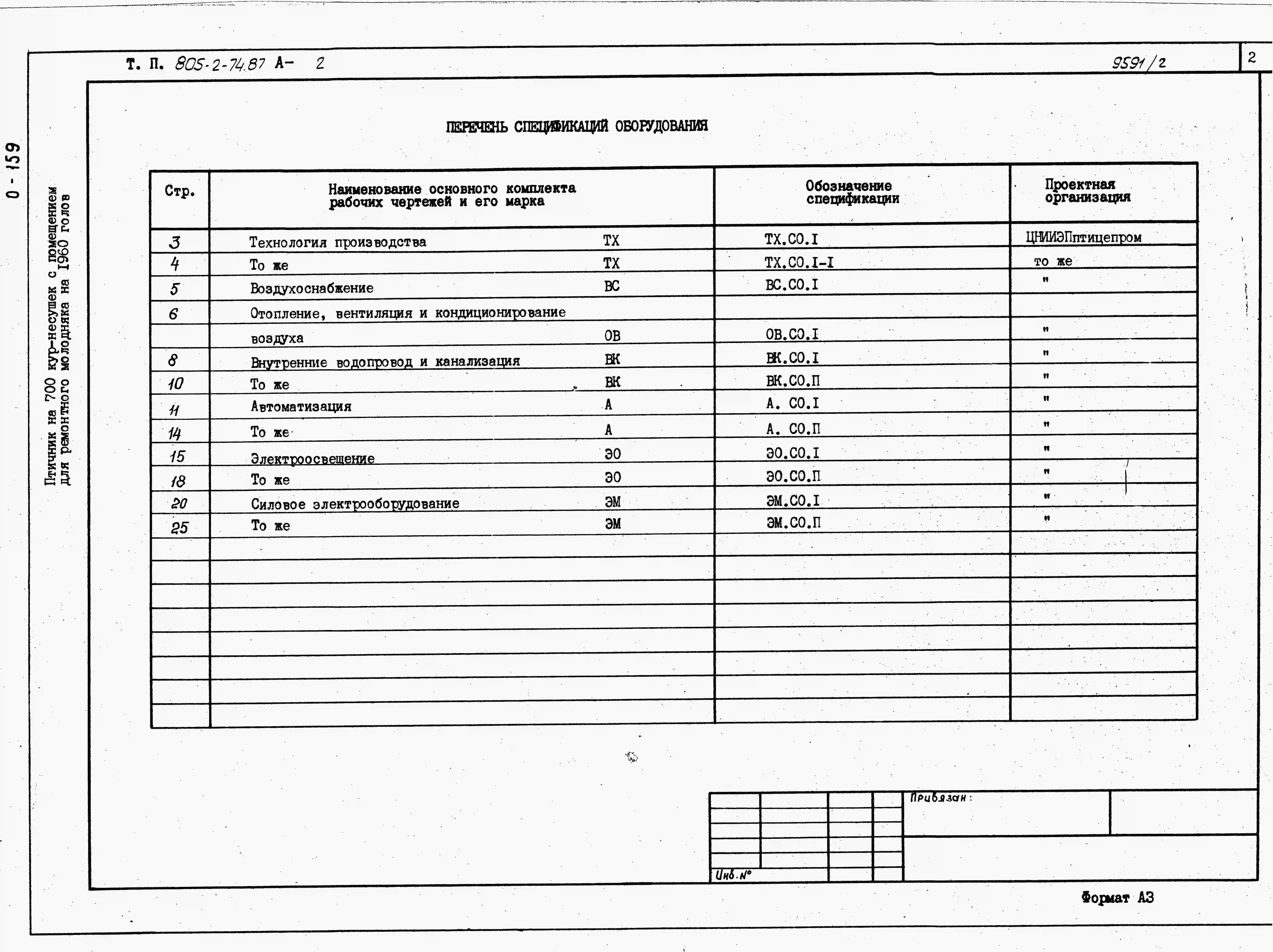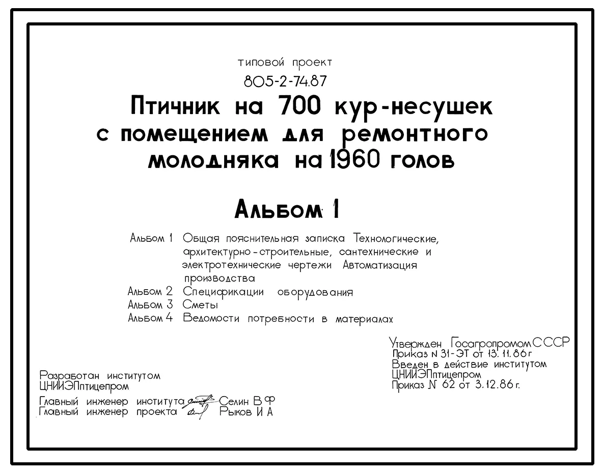 Типовой проект 805-2-74.87 Птичник на 700 голов кур-несушек с помещением для ремонтного молодняка на 1960 голов. Содержание птицы на глубокой подстилке