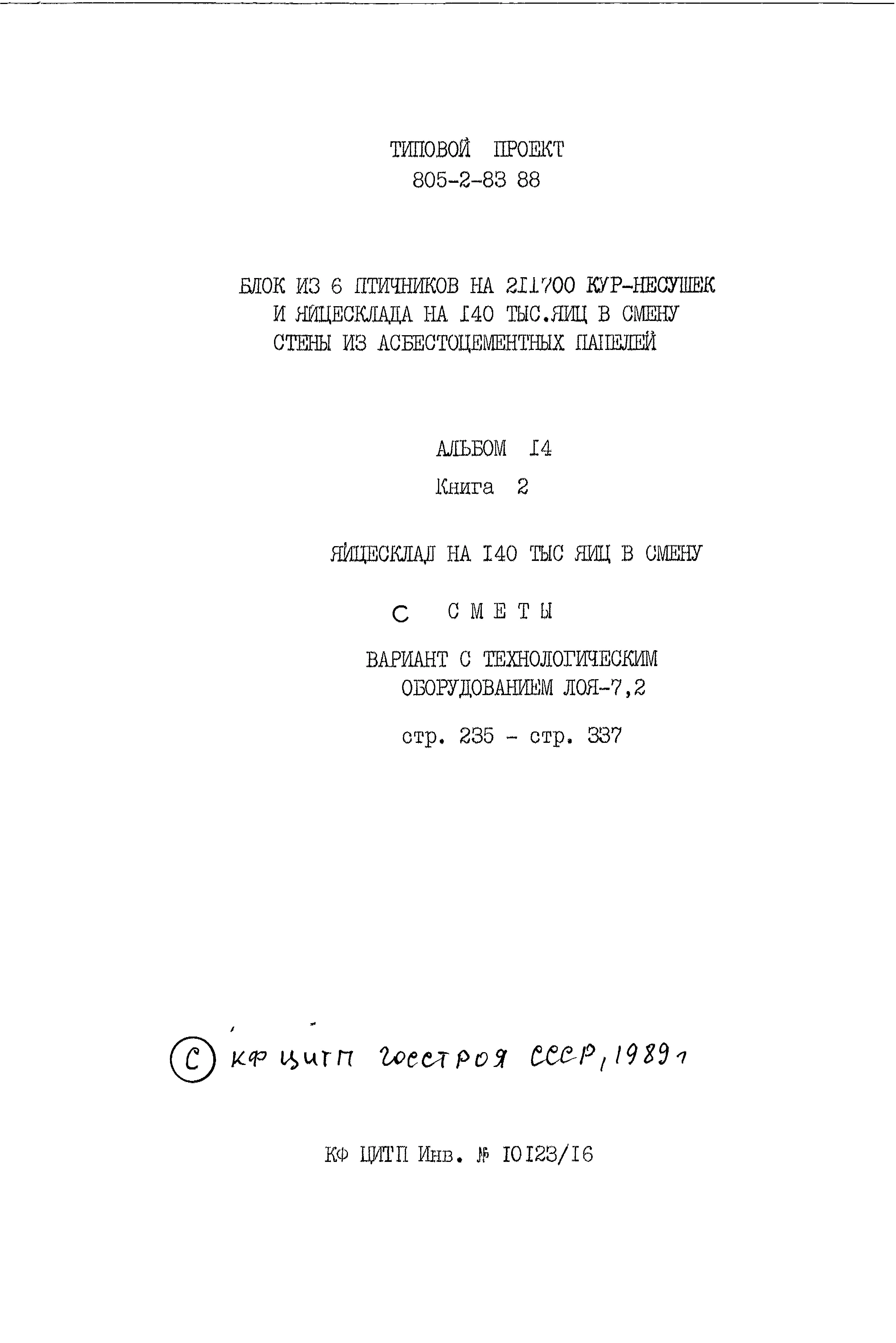 Типовой проект 805-2-83.88 Блок из 6 птичников на 211700 кур-несушек и яйцесклада на 140 тыс. яиц в смену. Содержание кур в клеточных батареях БКН-3. Стены из асбестоцементных панелей