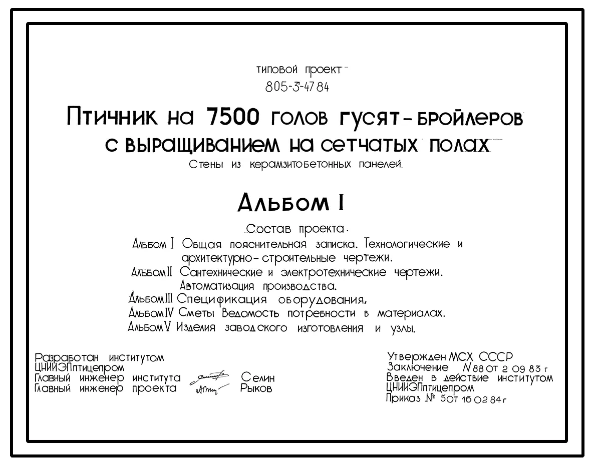 Типовой проект 805-3-47.84 Птичник на 7500 голов гусят-бройлеров с выращиванием на сетчатых полах