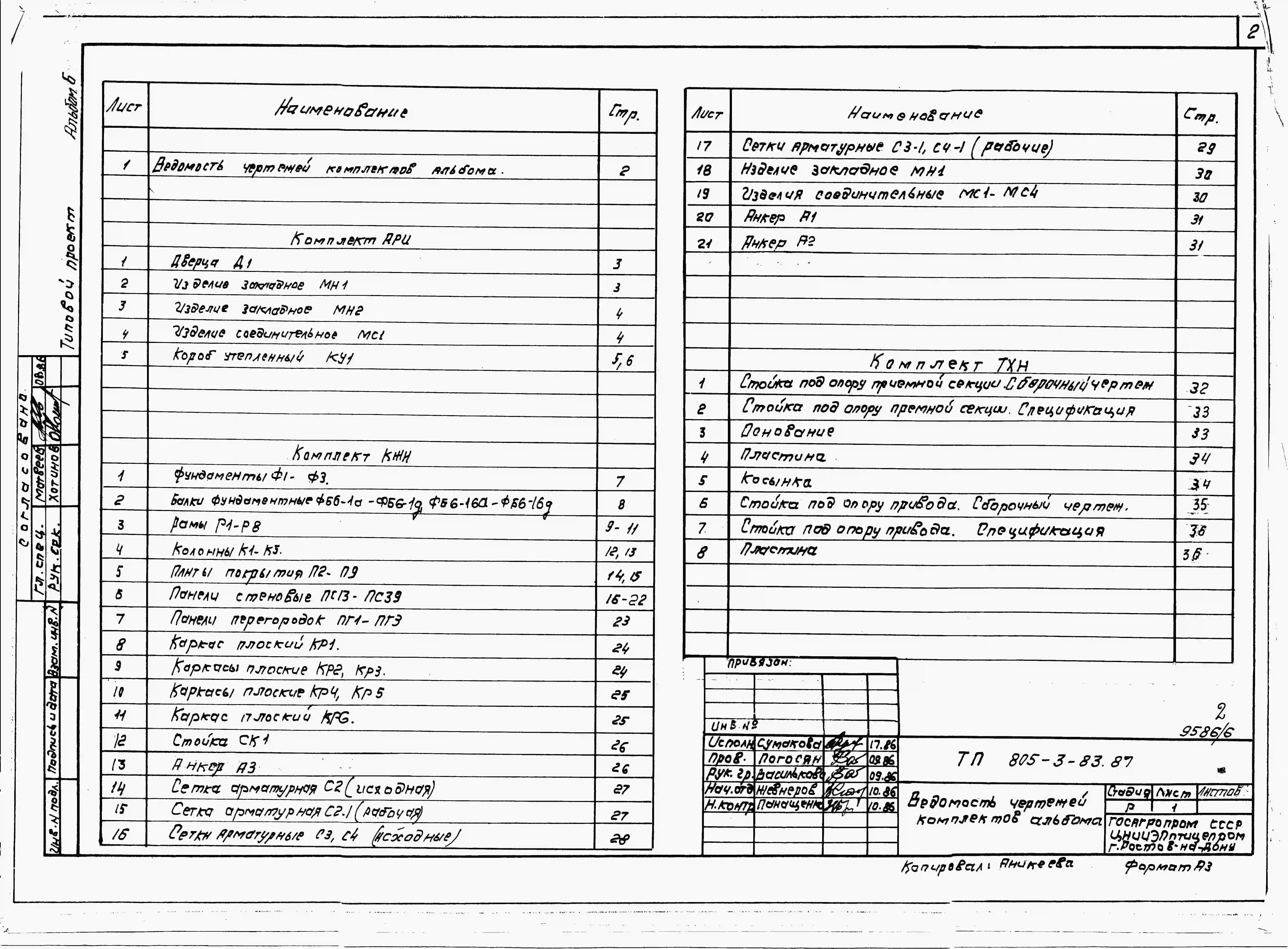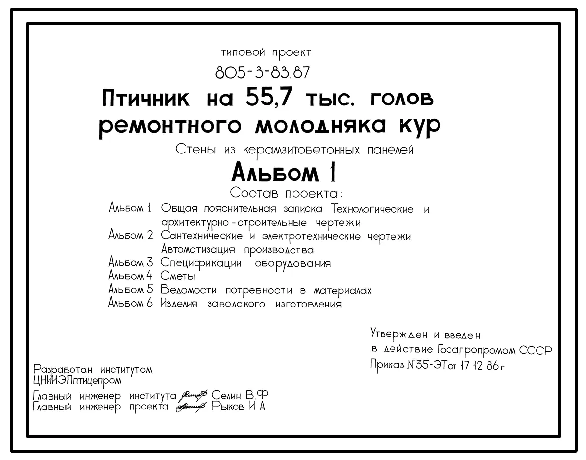 Типовой проект 805-3-83.87 Птичник на 55,7 тыс. голов ремонтного молодняка кур. Содержание птицы в клеточных батареях БКМ-3В. Стены из легкобетонных панелей и кирпича.
