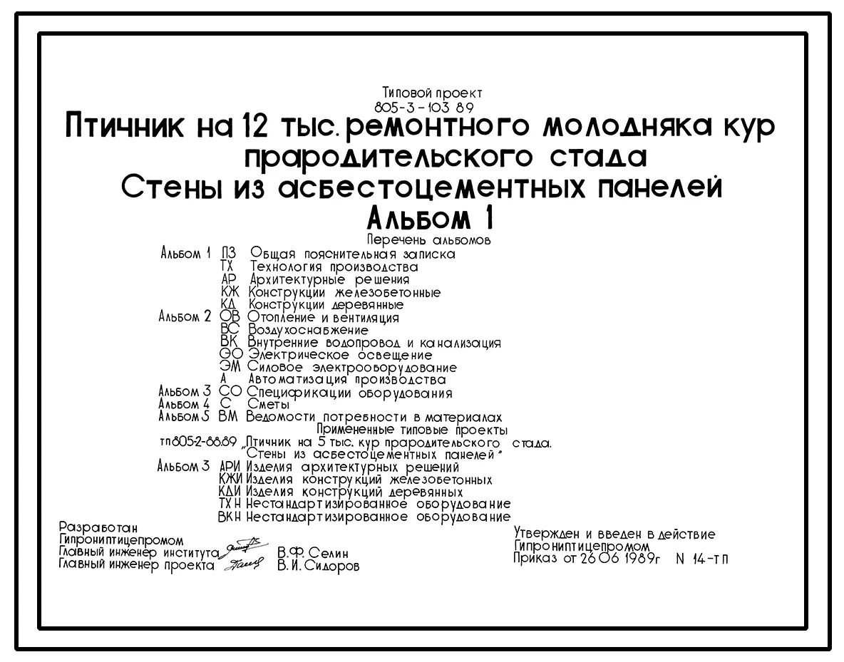 Типовой проект 805-3-103.89 Птичник на 12 тыс. ремонтного молодняка кур прародительского стада. Стены из асбестоцементных панелей