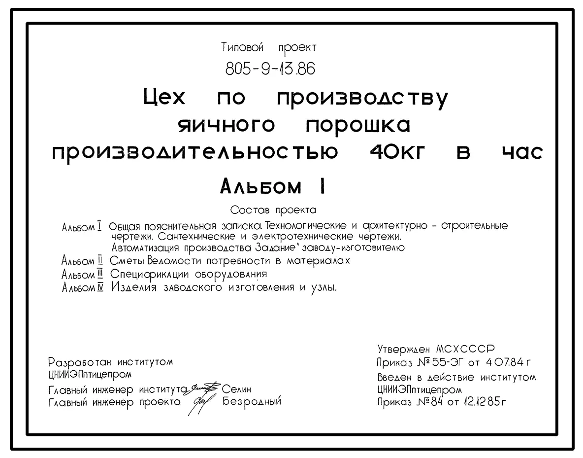 Типовой проект 805-9-13.86 Цех по производству яичного порошка производительностью 40 кг в час