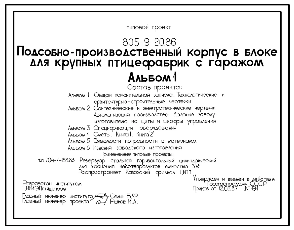 Типовой проект 805-9-20.86 Подсобно-производственный корпус в блоке с гаражом для крупных птицефабрик