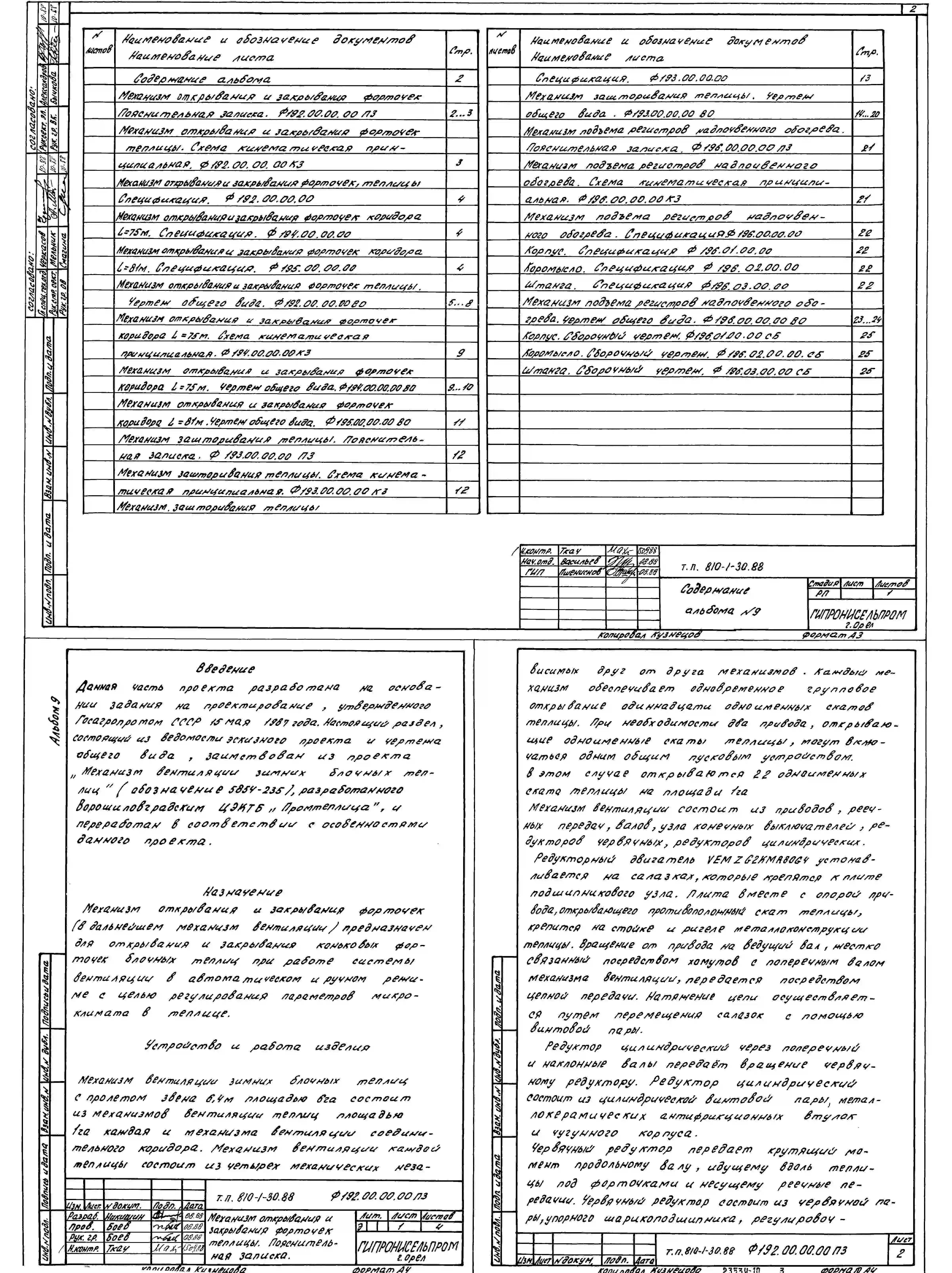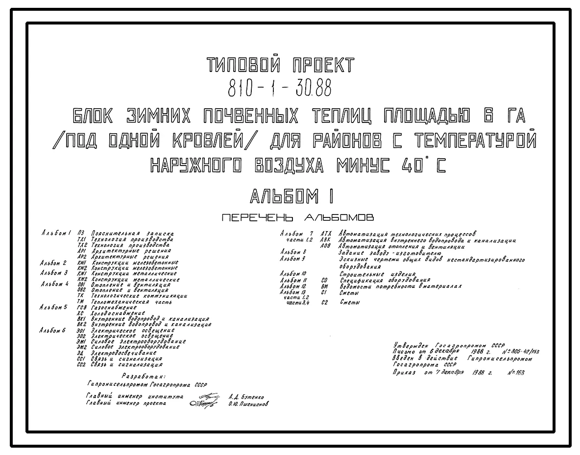 Типовой проект 810-1-30.88 Блок зимних почвенных теплиц площадью 6 га (под одной кровлей). В составе теплицы - вспомогательные помещения общей площадью 1584 м2. Размеры теплицы - 6(288,33 х 231,6) м. Расчетная температура: -40°С. Каркас теплицы - металлич