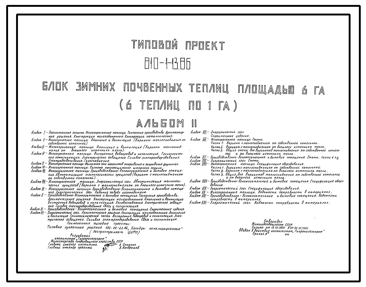Типовой проект 810-1-13.86 Блок зимних почвенных теплиц площадью 6 га. В составе теплицы - вспомогательные помещения общей площадью 880 м2. Размеры теплицы - 3 (75x288,3) м. Расчетная температура: -30°С. Каркас теплицы - металлический; стены и покрытие –