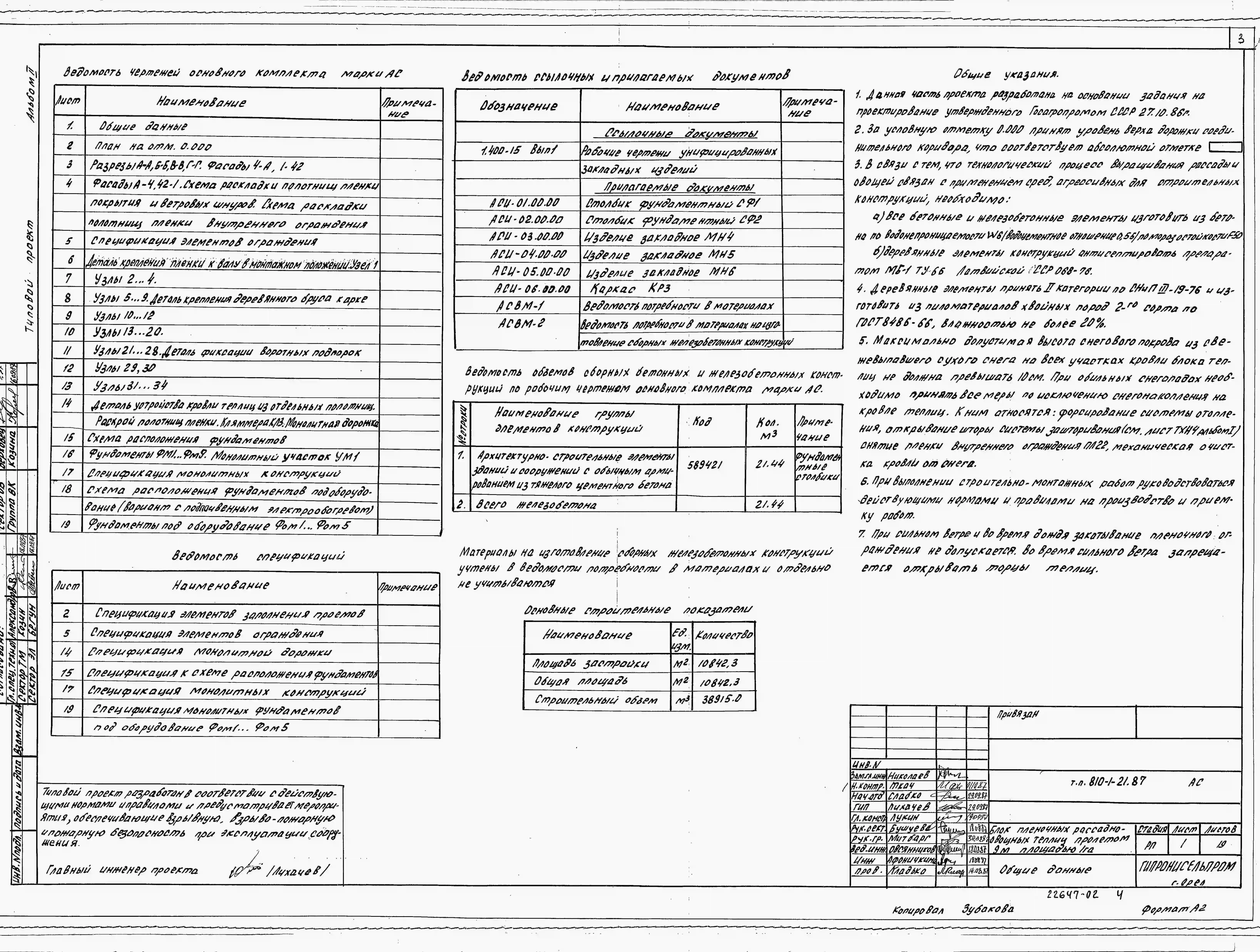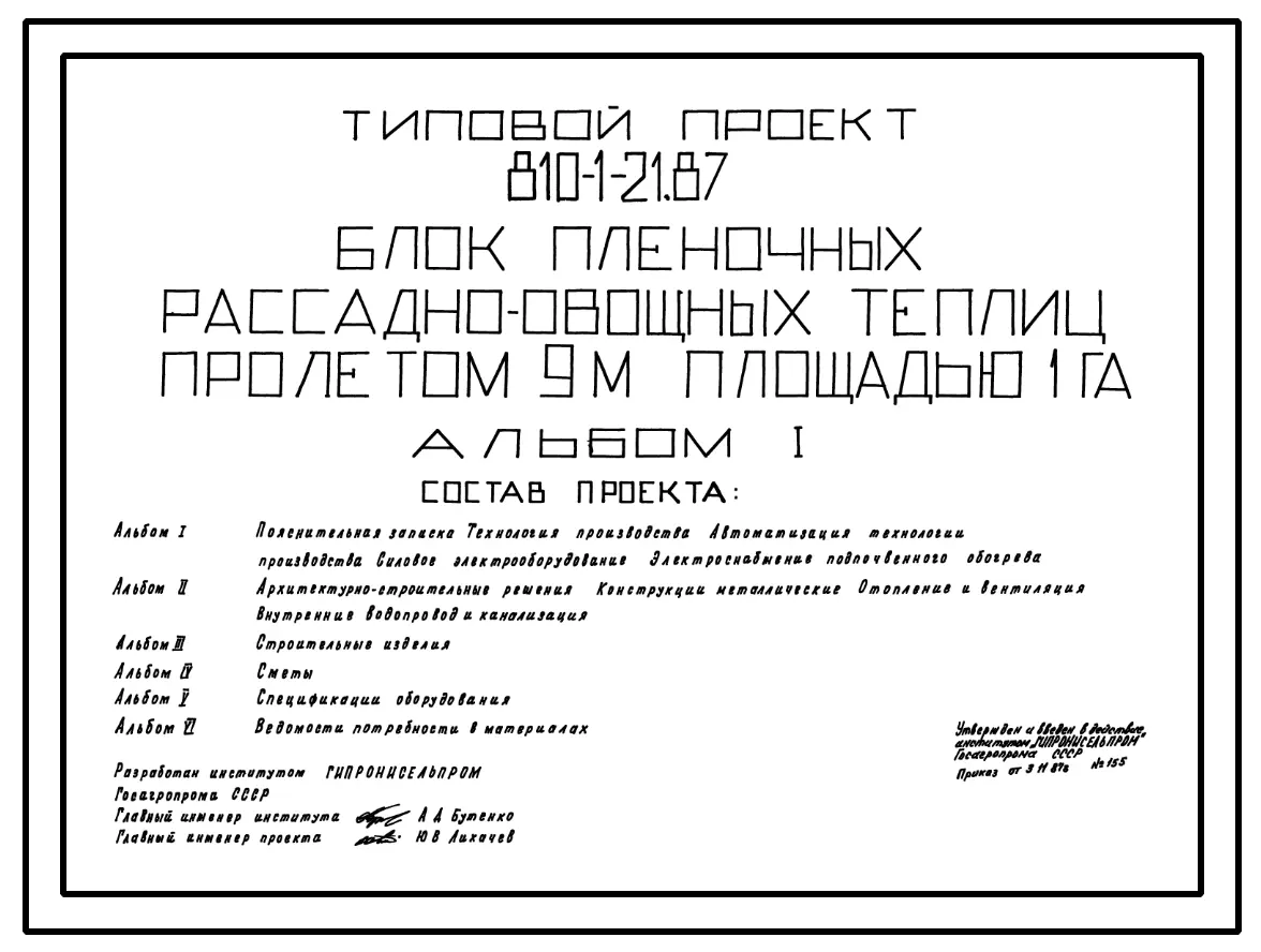 Типовой проект 810-1-21.87 Блок пленочных рассадно-овощных теплиц пролетом 9 м площадью 1 га. Размеры теплицы - 10(9x118) м. Расчетная температура: -15°С. Арки – металлические. Покрытие и боковое ограждение - полиэтиленовая пленка