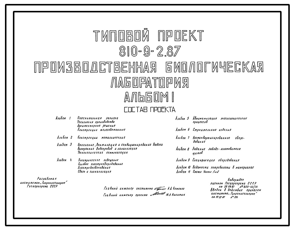 Типовой проект 810-9-2.87 Производственная биологическая лаборатория (для производства 32,5 млн. особей насекомых для биологической защиты растений на тепличных комбинатах площадью 12 га). Размеры: лаборатории 18x42 м, теплицы 21x32+ 21x25,6 м.