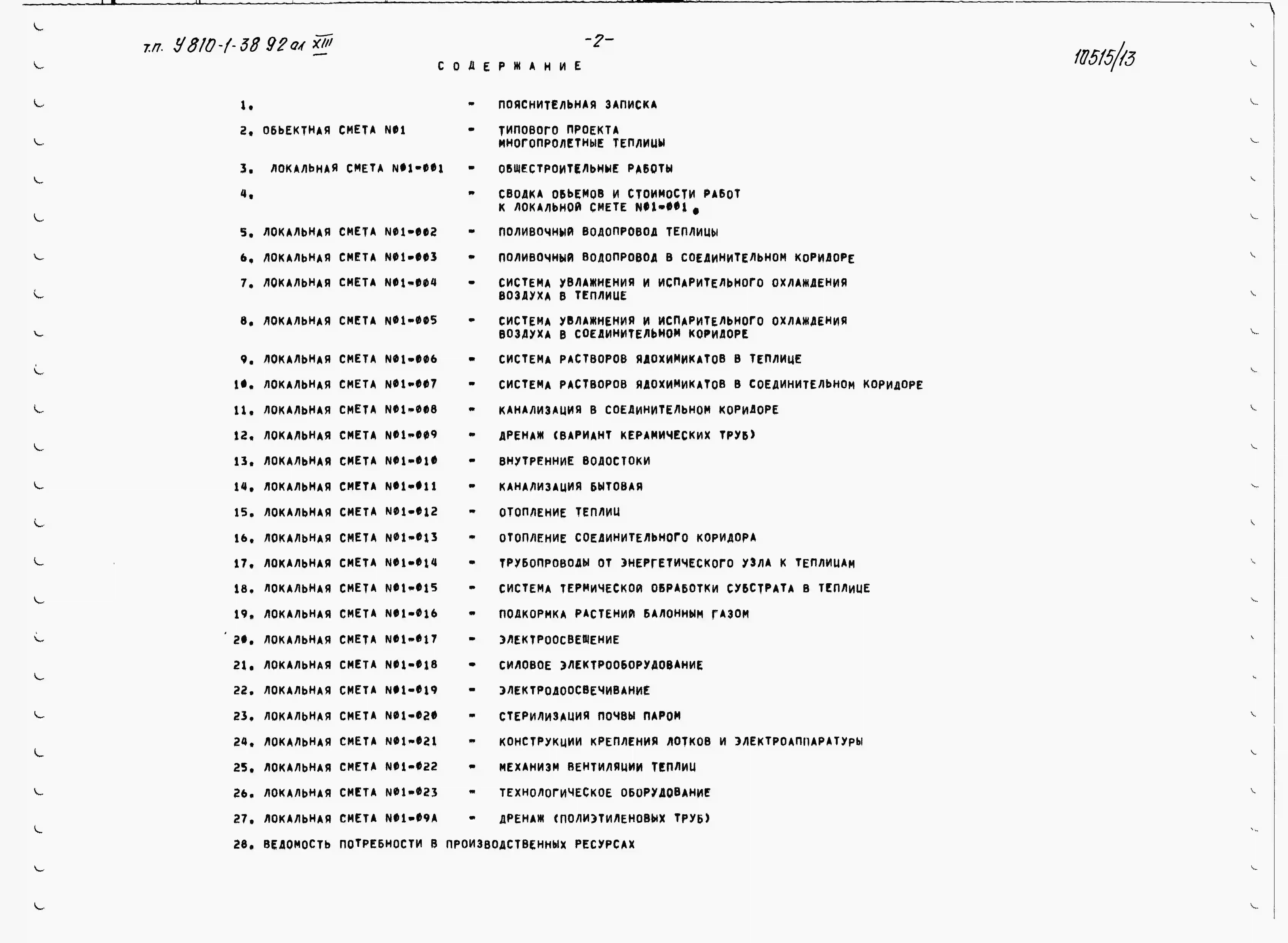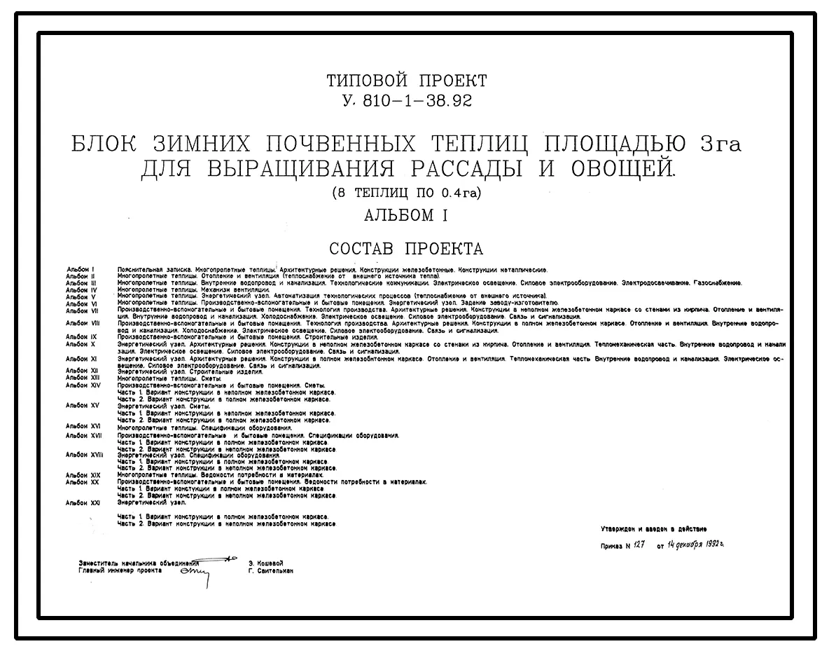 Типовой проект У.810-1-38.92 Блок зимних почвенных теплиц площадью 3,0 га для выращивания рассады и овощей (8 теплиц по 0,4 га)